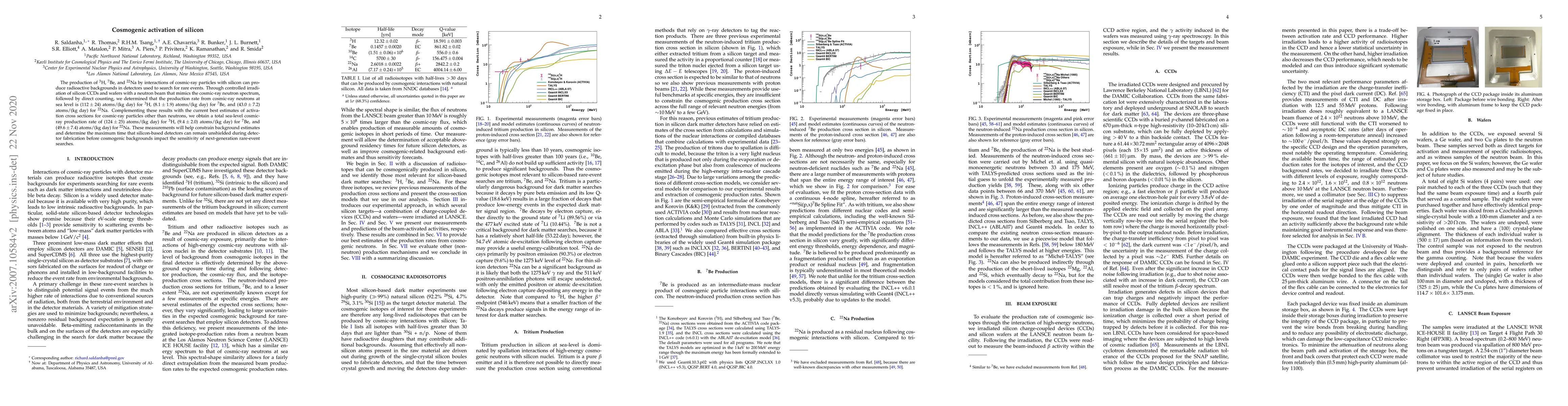 The production of $^{3}$H, $^{7}$Be, and $^{22}$Na by interactions of cosmic-ray particles with silicon can produce radioactive backgrounds in detectors used to search for rare events. Through controlled irradiation of silicon CCDs and wafers with a neutron beam that mimics the cosmic-ray neutron spectrum, followed by direct counting, we determined that the production rate from cosmic-ray neutrons at sea level is ($112 \pm 24$) atoms/(kg day) for $^{3}$H, ($8.1 \pm 1.9 $) atoms/(kg day) for $^{7}$Be, and ($43.0 \pm 7.1 $) atoms/(kg day) for $^{22}$Na. Complementing these results with the current best estimates of activation cross sections for cosmic-ray particles other than neutrons, we obtain a total sea-level cosmic-ray production rate of ($124 \pm 24$) atoms/(kg day) for $^{3}$H, ($9.4 \pm 2.0 $) atoms/(kg day) for $^{7}$Be, and ($49.6 \pm 7.3 $) atoms/(kg day) for $^{22}$Na. These measurements will help constrain background estimates and determine the maximum time that silicon-based detectors can remain unshielded during detector fabrication before cosmogenic backgrounds impact the sensitivity of next-generation rare-event searches.