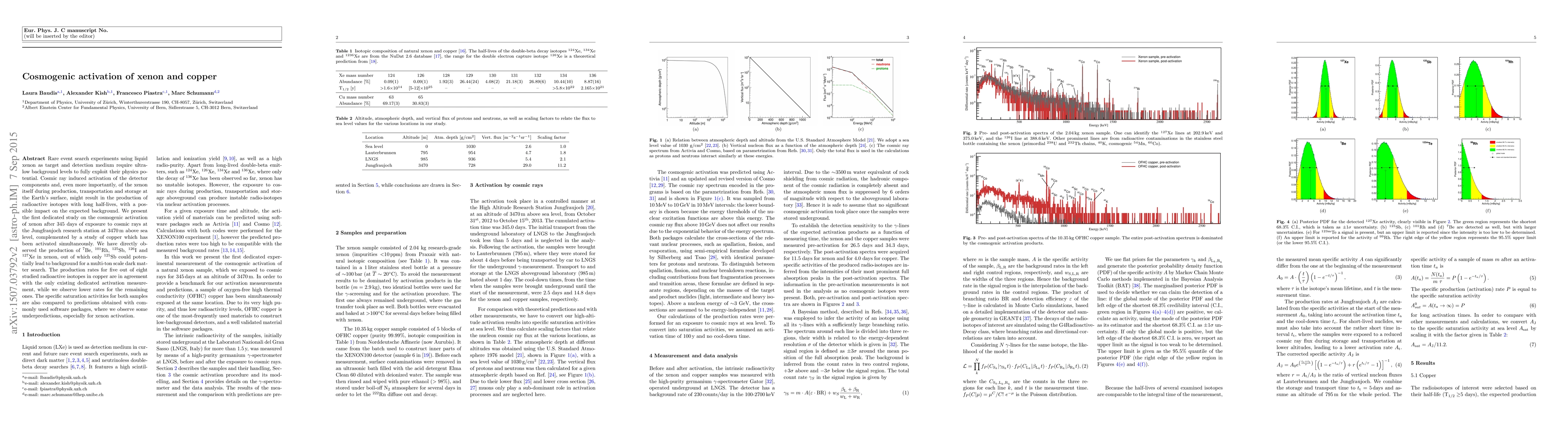 Rare event search experiments using liquid xenon as target and detection medium require ultra-low background levels to fully exploit their physics potential. Cosmic ray induced activation of the detector components and, even more importantly, of the xenon itself during production, transportation and storage at the Earth's surface, might result in the production of radioactive isotopes with long half-lives, with a possible impact on the expected background. We present the first dedicated study on the cosmogenic activation of xenon after 345 days of exposure to cosmic rays at the Jungfraujoch research station at 3470m above sea level, complemented by a study of copper which has been activated simultaneously. We have directly observed the production of 7Be, 101Rh, 125Sb, 126I and 127Xe in xenon, out of which only 125Sb could potentially lead to background for a multi-ton scale dark matter search. The production rates for five out of eight studied radioactive isotopes in copper are in agreement with the only existing dedicated activation measurement, while we observe lower rates for the remaining ones. The specific saturation activities for both samples are also compared to predictions obtained with commonly used software packages, where we observe some underpredictions, especially for xenon activation.