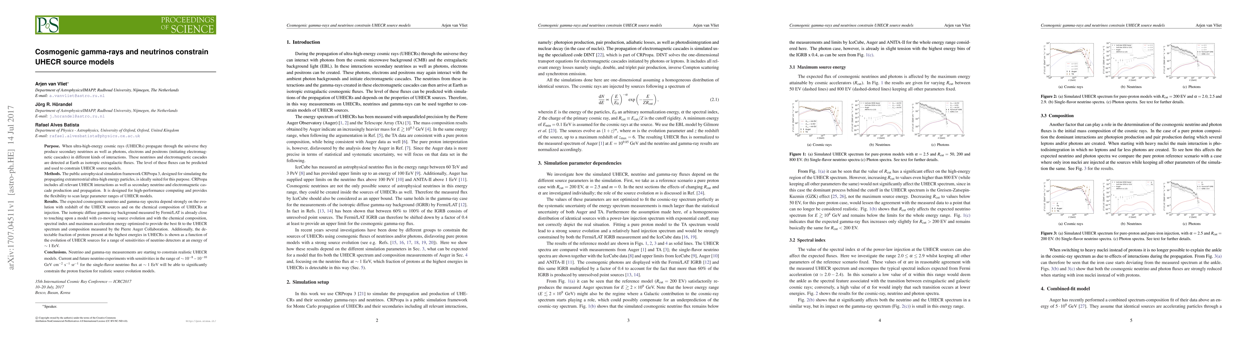 This paper uses CRPropa 3 to model the cosmogenic neutrino and gamma-ray spectra from UHECR sources, finding that current Fermi/LAT gamma-ray data nearly constrains optimal models of UHECR source evolution and composition. Future experiments with high sensitivity to high-energy neutrinos will further constrain the proton fraction in UHECRs.