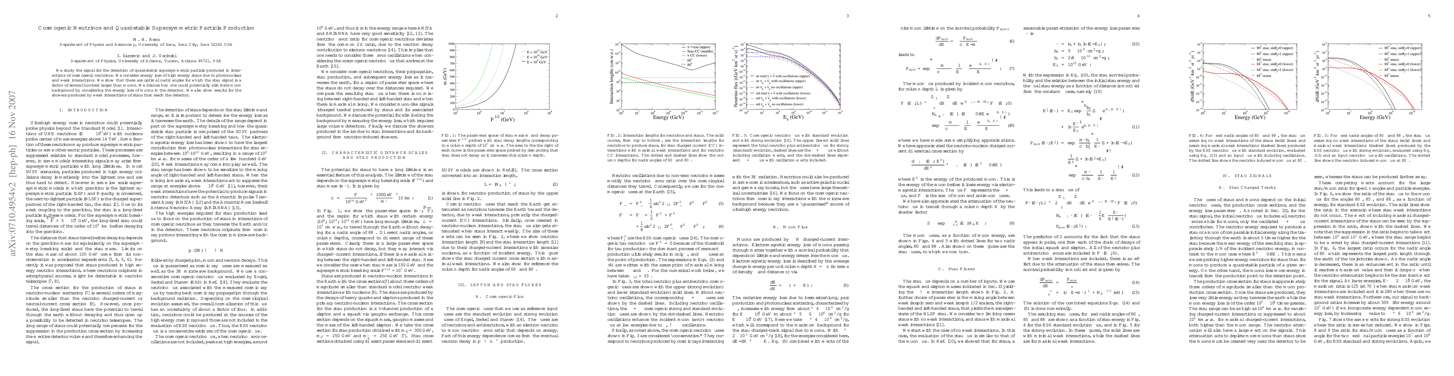 We study the signal for the detection of quasi-stable supersymmetric particles produced in interactions of cosmogenic neutrinos. We consider energy loss of high energy staus due to photonuclear and weak interactions. We show that there are optimal nadir angles for which the stau signal is a factor of several hundred larager than muons. We discuss how one could potentially eliminate the muon background by considering the energy loss of muons in the detector. We also show results for the showers produced by weak interactions of staus that reach the detector.