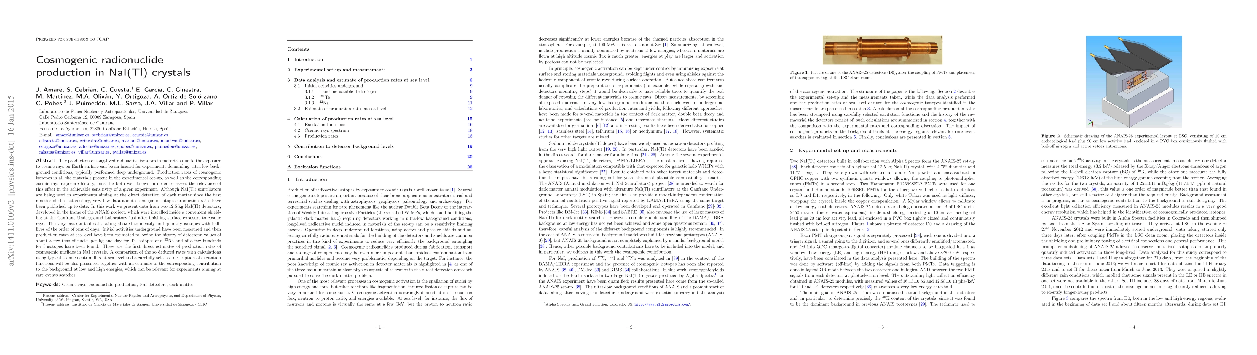 The production of long-lived radioactive isotopes in materials due to the exposure to cosmic rays on Earth surface can be an hazard for experiments demanding ultra-low background conditions, typically performed deep underground. Production rates of cosmogenic isotopes in all the materials present in the experimental set-up, as well as the corresponding cosmic rays exposure history, must be both well known in order to assess the relevance of this effect in the achievable sensitivity of a given experiment. Although NaI(Tl) scintillators are being used in experiments aiming at the direct detection of dark matter since the first nineties of the last century, very few data about cosmogenic isotopes production rates have been published up to date. In this work we present data from two 12.5 kg NaI(Tl) detectors, developed in the frame of the ANAIS project, which were installed inside a convenient shielding at the Canfranc Underground Laboratory just after finishing surface exposure to cosmic rays. The very fast start of data taking allowed to identify and quantify isotopes with half-lives of the order of tens of days. Initial activities underground have been measured and then production rates at sea level have been estimated following the history of detectors; values of about a few tens of nuclei per kg and day for Te isotopes and 22Na and of a few hundreds for I isotopes have been found. These are the first direct estimates of production rates of cosmogenic nuclides in NaI crystals. A comparison of the so deduced rates with calculations using typical cosmic neutron flux at sea level and a carefully selected description of excitation functions will be also presented together with an estimate of the corresponding contribution to the background at low and high energies, which can be relevant for experiments aiming at rare events searches.
