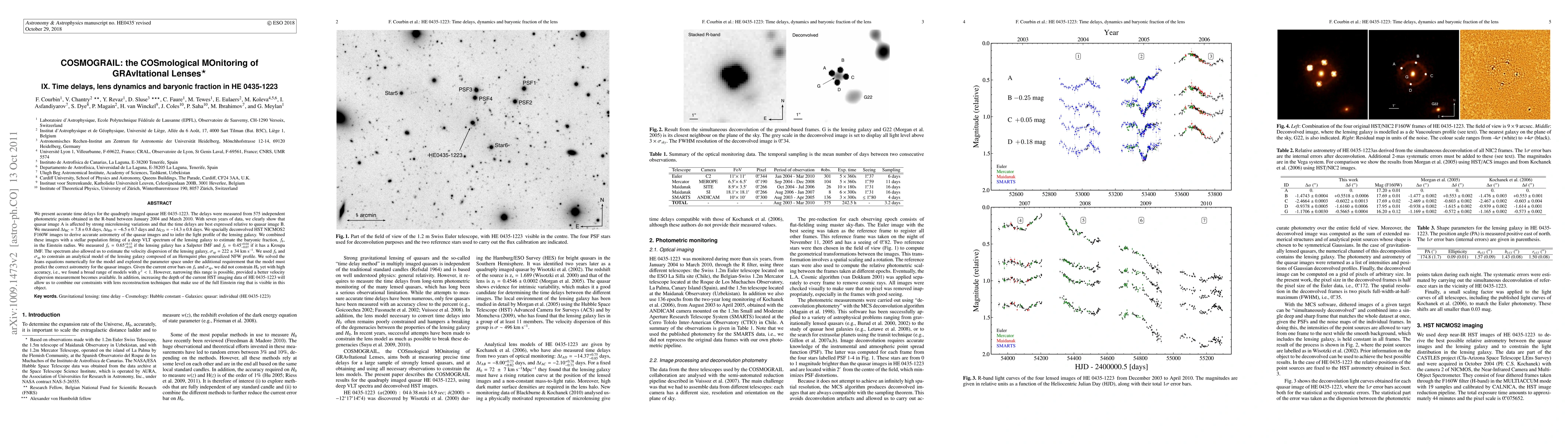 This paper reports precise time delays for the quasar HE 0435-1223, revealing microlensing effects on image A, and estimates the baryonic fraction within the lensing galaxy. The study also explores the galaxy's velocity dispersion and potential to constrain the Hubble constant, though current data limits precise modeling.