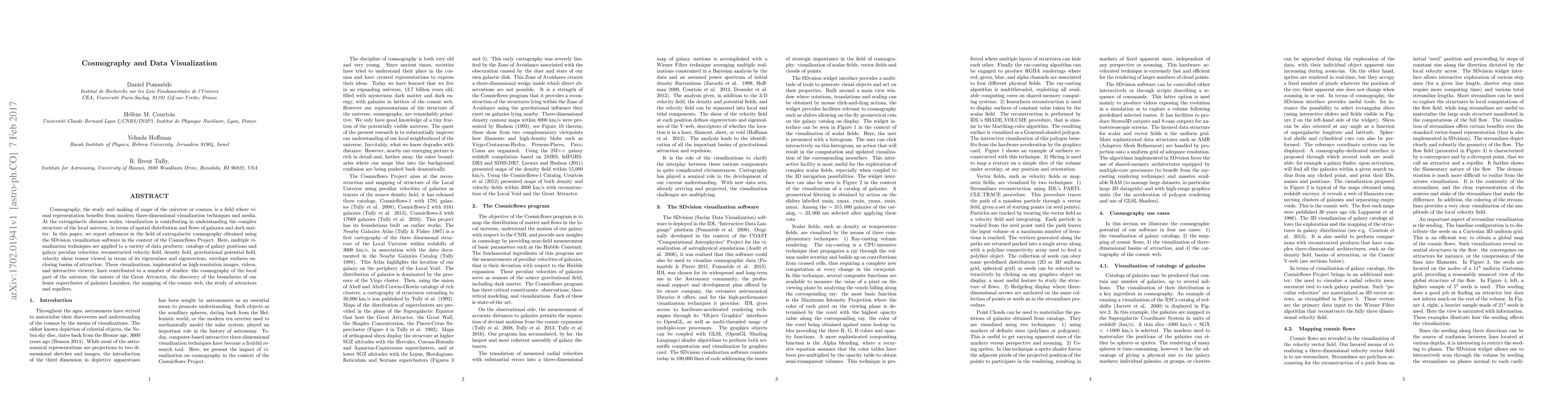 Cosmography, the study and making of maps of the universe or cosmos, is a field where visual representation benefits from modern three-dimensional visualization techniques and media. At the extragalactic distance scales, visualization is contributing in understanding the complex structure of the local universe, in terms of spatial distribution and flows of galaxies and dark matter. In this paper, we report advances in the field of extragalactic cosmography obtained using the SDvision visualization software in the context of the Cosmicflows Project. Here, multiple visualization techniques are applied to a variety of data products: catalogs of galaxy positions and galaxy peculiar velocities, reconstructed velocity field, density field, gravitational potential field, velocity shear tensor viewed in terms of its eigenvalues and eigenvectors, envelope surfaces enclosing basins of attraction. These visualizations, implemented as high-resolution images, videos, and interactive viewers, have contributed to a number of studies: the cosmography of the local part of the universe, the nature of the Great Attractor, the discovery of the boundaries of our home supercluster of galaxies Laniakea, the mapping of the cosmic web, the study of attractors and repellers.