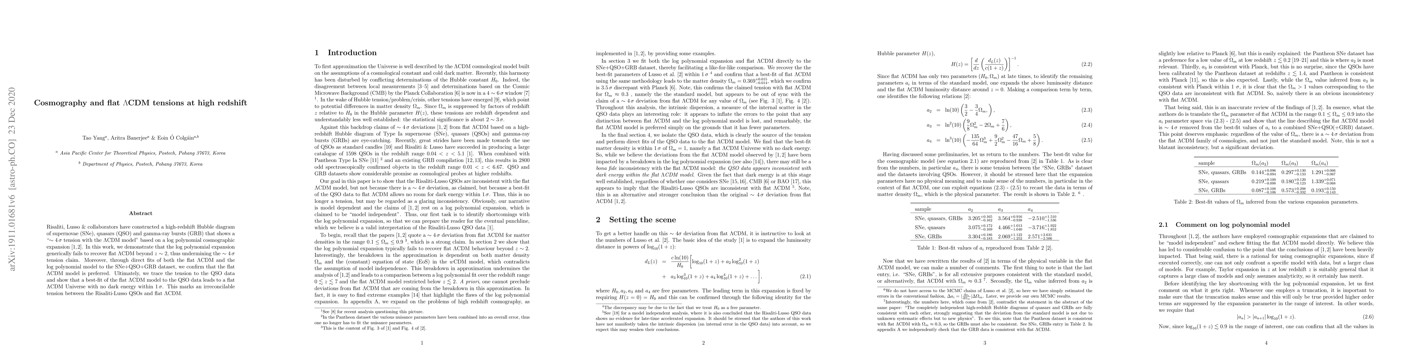Risaliti, Lusso \& collaborators have constructed a high-redshift Hubble diagram of supernovae (SNe); quasars (QSO) and gamma-ray bursts (GRB) that shows a "$\sim 4 \, \sigma$ tension with the $\Lambda$CDM model" based on a log polynomial cosmographic expansion (Risaliti et.al 2018, Lusso et.al 2019). In this work, we demonstrate that the log polynomial expansion generically fails to recover flat $\Lambda$CDM beyond $z \sim 2$, thus undermining the $\sim 4 \, \sigma$ tension claim. Moreover, through direct fits of both the flat $\Lambda$CDM and the log polynomial model to the SNe+QSO+GRB dataset, we confirm that the flat $\Lambda$CDM model is preferred. Ultimately, we trace the tension to the QSO data and show that a best-fit of the flat $\Lambda$CDM model to the QSO data leads to a flat $\Lambda$CDM Universe with no dark energy within $1 \, \sigma$. This marks an irreconcilable tension between the Risaliti-Lusso QSOs and flat $\Lambda$CDM.