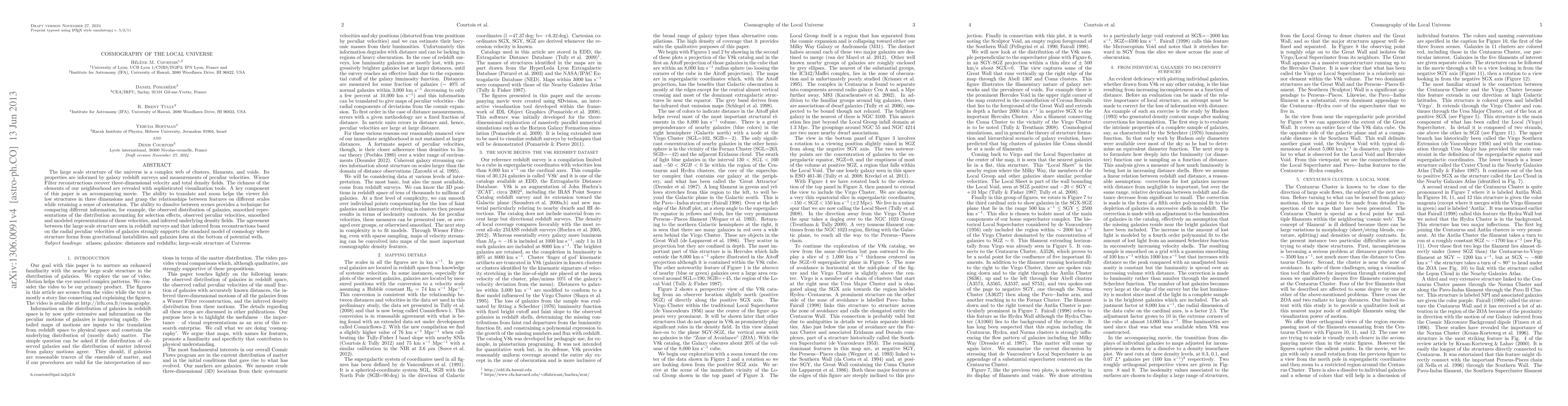 The large scale structure of the universe is a complex web of clusters, filaments, and voids. Its properties are informed by galaxy redshift surveys and measurements of peculiar velocities. Wiener Filter reconstructions recover three-dimensional velocity and total density fields. The richness of the elements of our neighborhood are revealed with sophisticated visualization tools. A key component of this paper is an accompanying movie that can be viewed and downloaded at : http://irfu.cea.fr/cosmography or http://vimeo.com/pomarede/cosmography .The ability to translate and zoom helps the viewer follow structures in three dimensions and grasp the relationships between features on different scales while retaining a sense of orientation. The ability to dissolve between scenes provides a technique for comparing different information, for example, the observed distribution of galaxies, smoothed representations of the distribution accounting for selection effects, observed peculiar velocities, smoothed and modeled representations of those velocities, and inferred underlying density fields. The agreement between the large scale structure seen in redshift surveys and that inferred from reconstructions based on the radial peculiar velocities of galaxies strongly supports the standard model of cosmology where structure forms from gravitational instabilities and galaxies form at the bottom of potential wells.