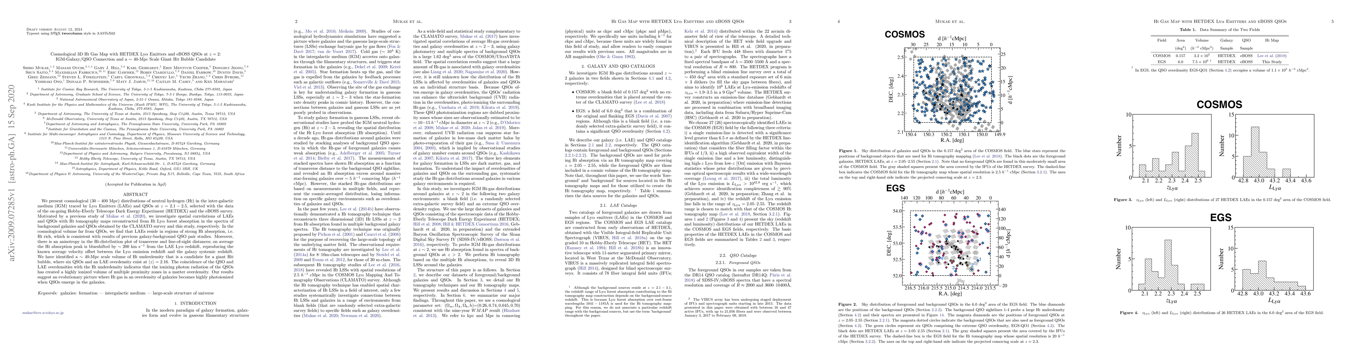 We present cosmological ($30-400$ Mpc) distributions of neutral hydrogen (HI) in the inter-galactic medium (IGM) traced by Ly$\alpha$ Emitters (LAEs) and QSOs at $z=2.1-2.5$, selected with the data of the on-going Hobby-Eberly Telescope Dark Energy Experiment (HETDEX) and the eBOSS survey. We investigate spatial correlations of LAEs and QSOs with HI tomography maps reconstructed from HI Ly$\alpha$ forest absorption in the spectra of background galaxies and QSOs obtained by the CLAMATO survey and this study, respectively. In the cosmological volume far from QSOs, we find that LAEs reside in regions of strong HI absorption, i.e. HI rich, which is consistent with results of previous galaxy-background QSO pair studies. Moreover, there is an anisotropy in the HI-distribution plot of transverse and line-of-sight distances; on average the HI absorption peak is blueshifted by $\sim 200$ km s$^{-1}$ from the LAE Ly$\alpha$ redshift, reproducing the known average velocity offset between the Ly$\alpha$ emission redshift and the galaxy systemic redshift. We have identified a $\sim$ 40-Mpc scale volume of HI underdensity that is a candidate for a giant HII bubble, where six QSOs and an LAE overdensity exist at $\left < z \right > =2.16$. The coincidence of the QSO and LAE overdensities with the HI underdensity indicates that the ionizing photon radiation of the QSOs has created a highly ionized volume of multiple proximity zones in a matter overdensity. Our results suggest an evolutionary picture where HI gas in an overdensity of galaxies becomes highly photoionized when QSOs emerge in the galaxies.