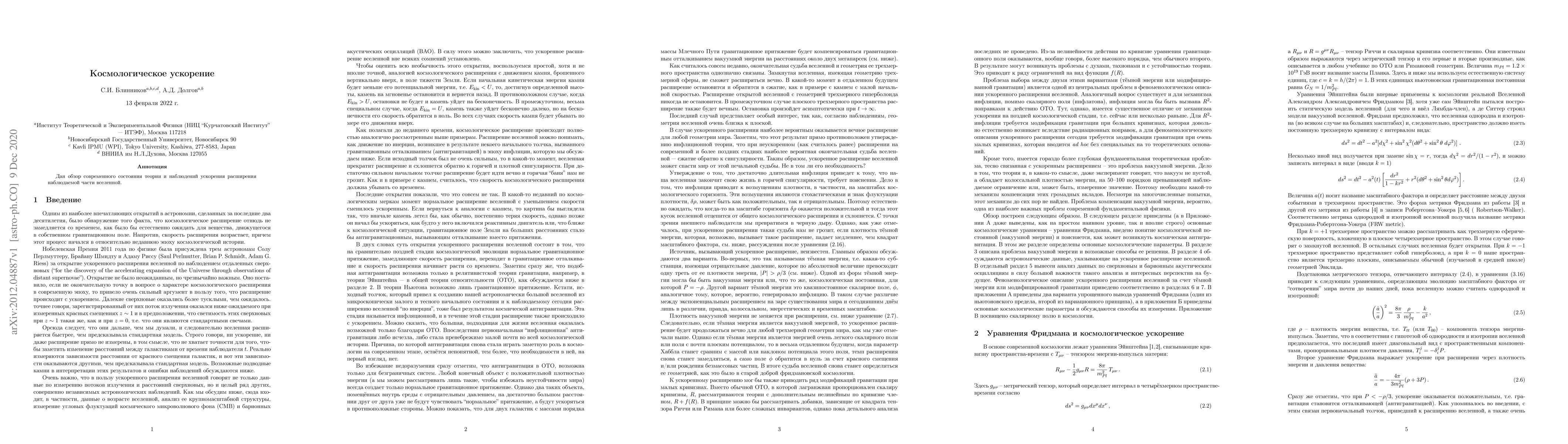 An overview is given of the current status of the theory and observations of the acceleration of the expansion of the observable part of the Universe. Contents 1. Historical Introduction 2. Friedmann equations and cosmological acceleration 3. Vacuum energy problem 4. Data in favor of cosmological acceleration 5.Data on supernovae and baryon acoustic oscillations 5.1 Cosmography primer: distances in the Universe; 5.2 Photometric distance; 5.3 Cosmic distance ladder; 5.4 Variety of type-Ia supernovae light curves and their usage in cosmography; 5.5 Baryon acoustic oscillations (BAOs); 5.6 BAOs in the correlation function of galaxies; 5.7 Summary of results on supernovae combined with BAOs; 5.8 Systematics and dependence on z; 5.9 Supernovae as primary distance indicators; 5.10 Merging of neutron stars and the standard siren method 6. Dark energy 7. Modified gravity 8.Conclusion 9.Appendices 9.1 Derivation of the Friedmann equations; 9.2 Cosmological parameters; 9.3 Scalar field