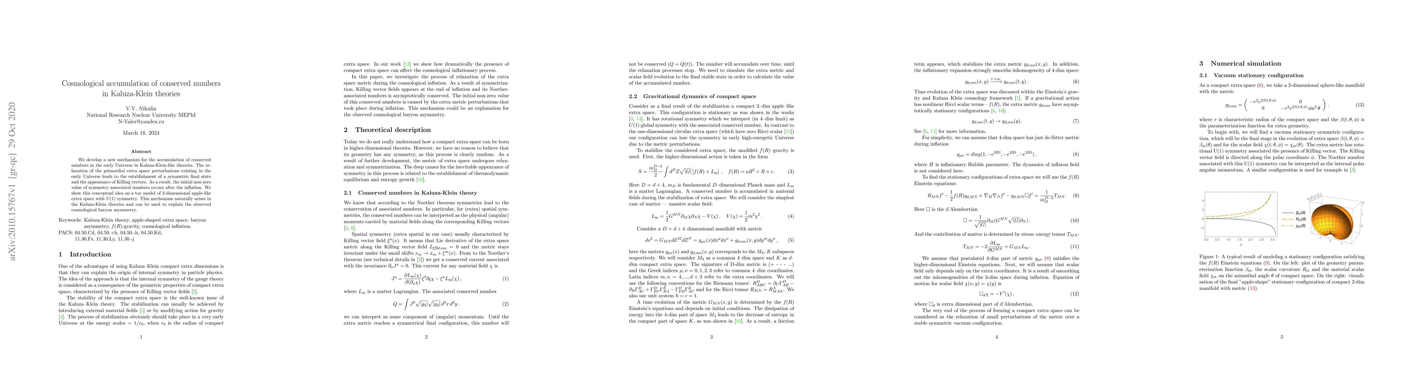 We develop a new mechanism for the accumulation of conserved numbers in the early Universe in Kaluza-Klein-like theories. The relaxation of the primordial extra space perturbations existing in the early Universe leads to the establishment of a symmetric final state and the appearance of Killing vectors. As a result, the initial non-zero value of symmetry associated numbers occurs after the inflation. We show this conceptual idea on a toy model of 2-dimensional apple-like extra space with U(1) symmetry. This mechanism naturally arises in the Kaluza-Klein theories and can be used to explain the observed cosmological baryon asymmetry.