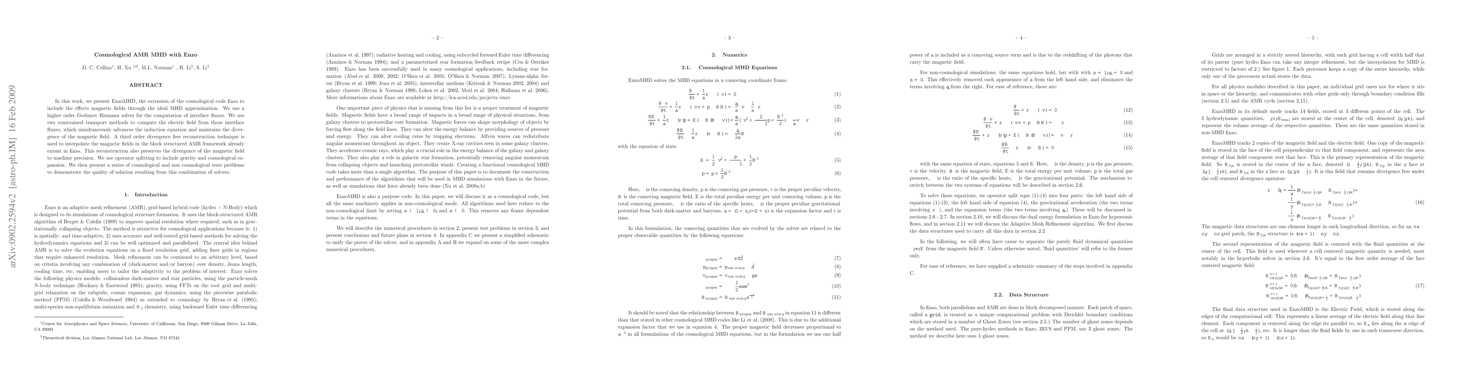 In this work, we present MHDEnzo, the extension of the cosmological code Enzo to include the effects magnetic fields through the ideal MHD approximation. We use a higher order Godunov Riemann solver for the computation of interface fluxes. We use two constrained transport methods to compute the electric field from those interface fluxes, which simultaneously advances the induction equation and maintains the divergence of the magnetic field. A third order divergence free reconstruction technique is used to interpolate the magnetic fields in the block structured AMR framework already extant in Enzo. This reconstruction also preserves the divergence of the magnetic field to machine precision. We use operator splitting to include gravity and cosmological expansion. We then present a series of cosmological and non cosmological tests problems to demonstrate the quality of solution resulting from this combination of solvers.