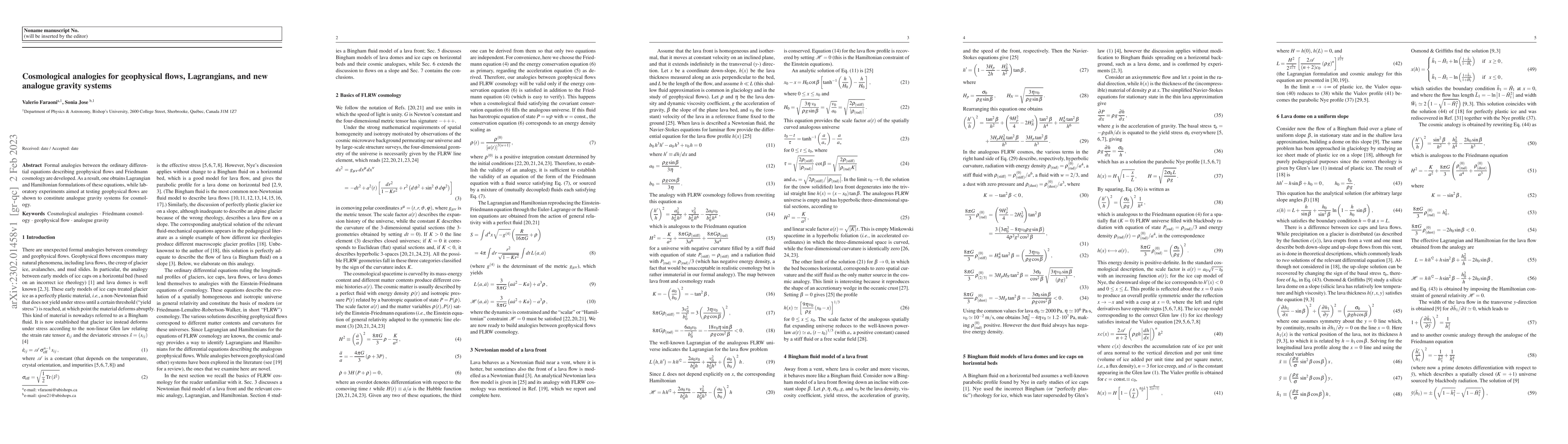 The research develops formal analogies between ordinary differential equations describing geophysical flows and Friedmann cosmology, leading to Lagrangian and Hamiltonian formulations. It identifies laboratory experiments testing geophysical flows as analogue gravity systems for cosmology.