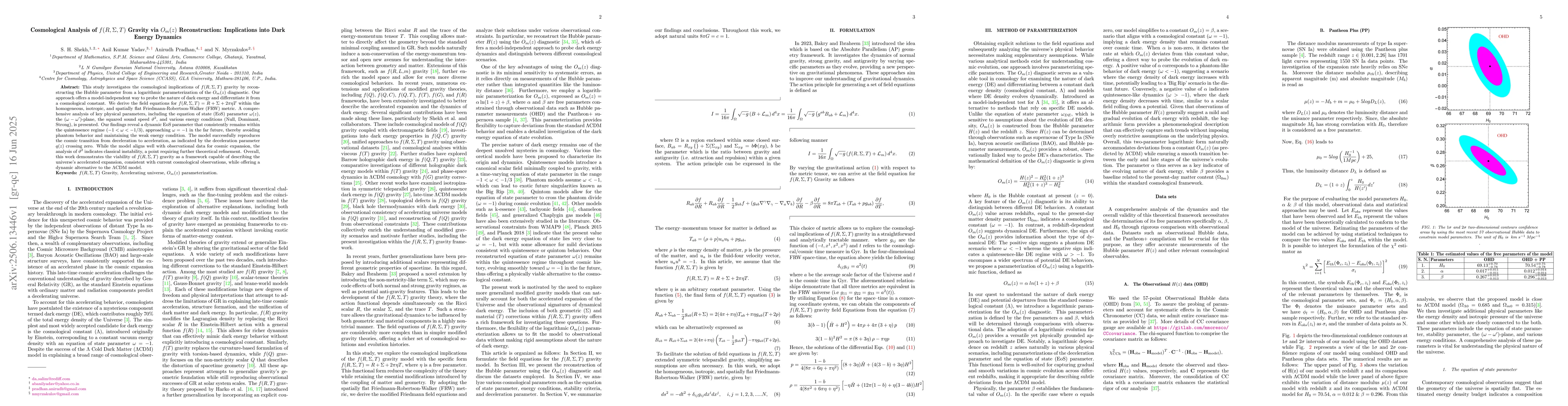This study investigates the cosmological implications of $f(R,\Sigma,T)$ gravity by reconstructing the Hubble parameter from a logarithmic parameterization of the $O_m(z)$ diagnostic. Our approach offers a model-independent way to probe the nature of dark energy and differentiate it from a cosmological constant. We derive the field equations for $f(R,\Sigma,T) = R + \Sigma + 2\pi\eta T$ within the homogeneous, isotropic, and spatially flat Friedmann-Robertson-Walker (FRW) metric. A comprehensive analysis of key physical parameters, including the equation of state (EoS) parameter $\omega(z)$, the $(\omega-\omega')$-plane, the squared sound speed $\vartheta^2$, and various energy conditions (Null, Dominant, Strong), is presented. Our findings reveal a dynamic EoS parameter that consistently remains within the quintessence regime ($-1 < \omega < -1/3$), approaching $\omega = -1$ in the far future, thereby avoiding phantom behavior and maintaining the weak energy condition. The model successfully reproduces the cosmic transition from deceleration to acceleration, as indicated by the deceleration parameter $q(z)$ crossing zero. While the model aligns well with observational data for cosmic expansion, the analysis of $\vartheta^2$ indicates classical instability, a point requiring further theoretical refinement. Overall, this work demonstrates the viability of $f(R,\Sigma,T)$ gravity as a framework capable of describing the universe's accelerated expansion, consistent with current cosmological observations, while offering a dynamic alternative to the $\Lambda$CDM model.