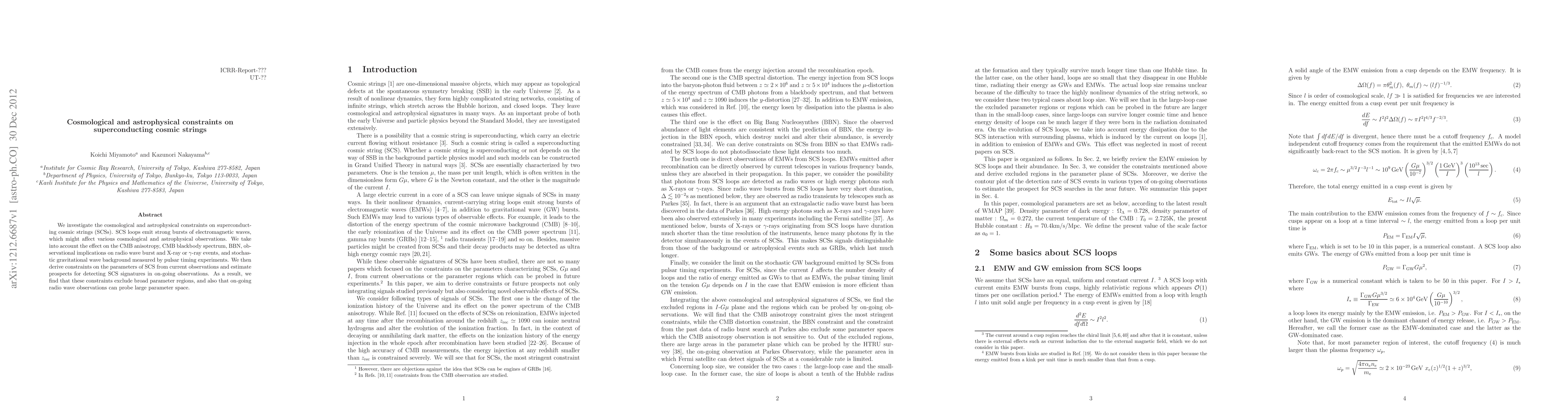 This paper examines the cosmological and astrophysical constraints on superconducting cosmic strings, analyzing their electromagnetic emissions' impact on various observations, including CMB and gravitational waves. It concludes that current observations exclude many parameter regions for SCSs, but ongoing radio wave observations have potential to probe significant portions of the remaining parameter space.