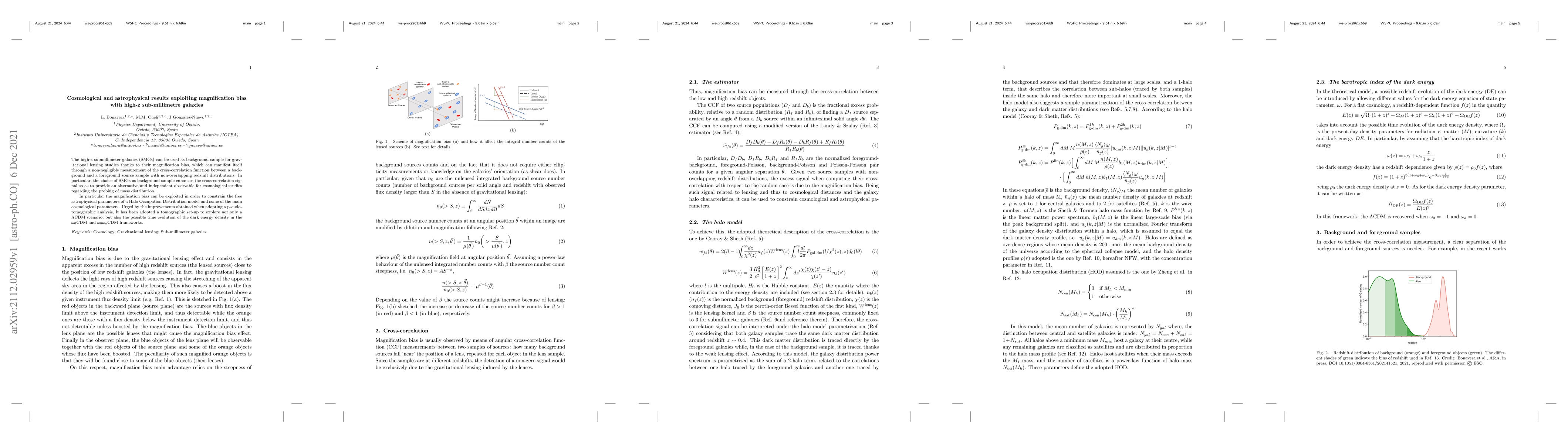 The high-z submillimeter galaxies (SMGs) can be used as background sample for gravitational lensing studies thanks to their magnification bias, which can manifest itself through a non-negligible measurement of the cross-correlation function between a background and a foreground source sample with non-overlapping redshift distributions. In particular, the choice of SMGs as background sample enhances the cross-correlation signal so as to provide an alternative and independent observable for cosmological studies regarding the probing of mass distribution. In particular the magnification bias can be exploited in order to constrain the free astrophysical parameters of a Halo Occupation Distribution model and some of the main cosmological parameters. Urged by the improvements obtained when adopting a pseudo-tomographic analysis, It has been adopted a tomographic set-up to explore not only a $\Lambda$CDM scenario, but also the possible time evolution of the dark energy density in the $\omega_0$CDM and $\omega_0\omega_a$CDM frameworks.