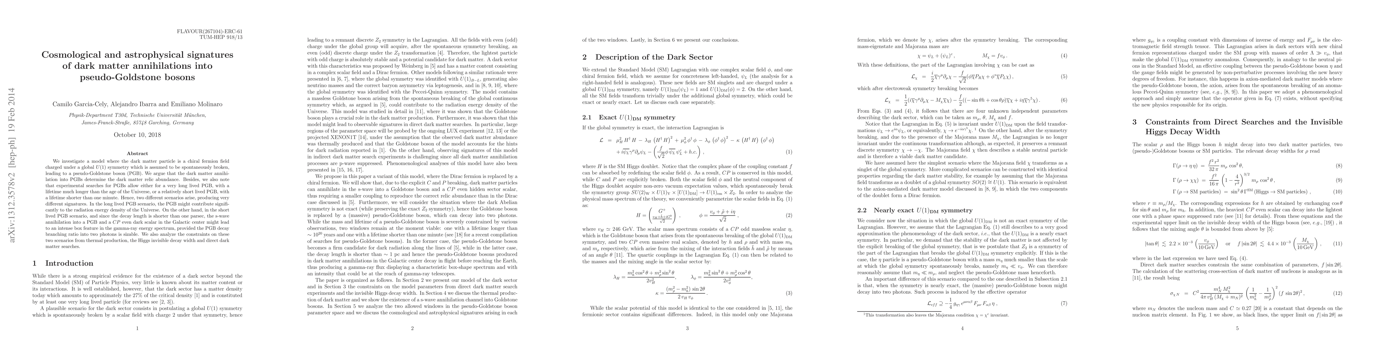 We investigate a model where the dark matter particle is a chiral fermion field charged under a global $U(1)$ symmetry which is assumed to be spontaneously broken, leading to a pseudo-Goldstone boson (PGB). We argue that the dark matter annihilation into PGBs determine the dark matter relic abundance. Besides, we also note that experimental searches for PGBs allow either for a very long lived PGB, with a lifetime much longer than the age of the Universe, or a relatively short lived PGB, with a lifetime shorter than one minute. Hence, two different scenarios arise, producing very different signatures. In the long lived PGB scenario, the PGB might contribute significantly to the radiation energy density of the Universe. On the other hand, in the short lived PGB scenario, and since the decay length is shorter than one parsec, the s-wave annihilation into a PGB and a $CP$ even dark scalar in the Galactic center might lead to an intense box feature in the gamma-ray energy spectrum, provided the PGB decay branching ratio into two photons is sizable. We also analyze the constraints on these two scenarios from thermal production, the Higgs invisible decay width and direct dark matter searches.