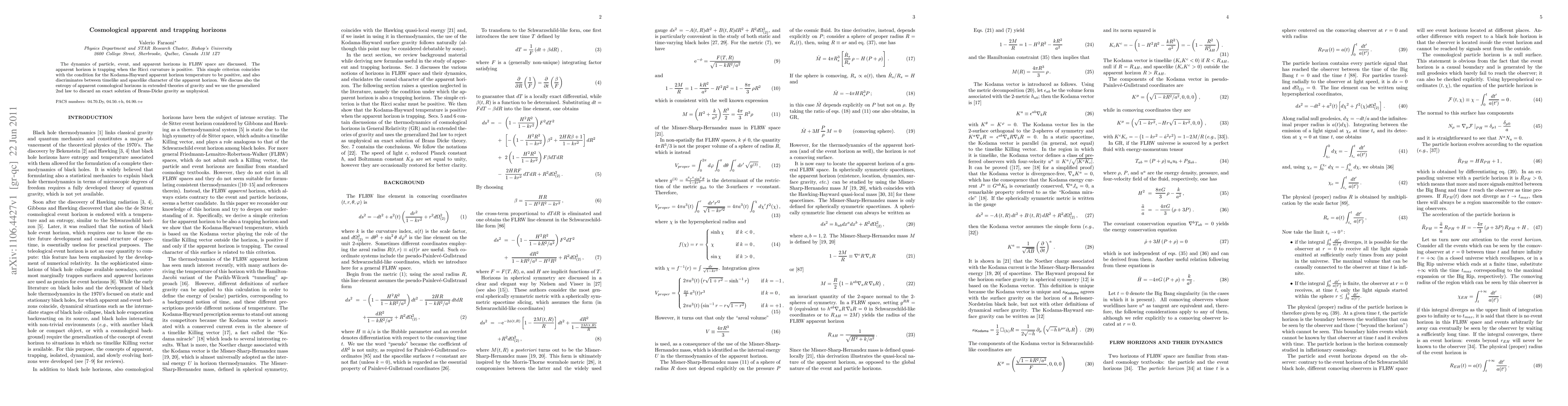 The dynamics of particle, event, and apparent horizons in FLRW space are discussed. The apparent horizon is trapping when the Ricci curvature is positive. This simple criterion coincides with the condition for the Kodama-Hayward apparent horizon temperature to be positive, and also discriminates between timelike and spacelike character of the apparent horizon. We discuss also the entropy of apparent cosmological horizons in extended theories of gravity and we use the generalized 2nd law to discard an exact solution of Brans-Dicke gravity as unphysical.