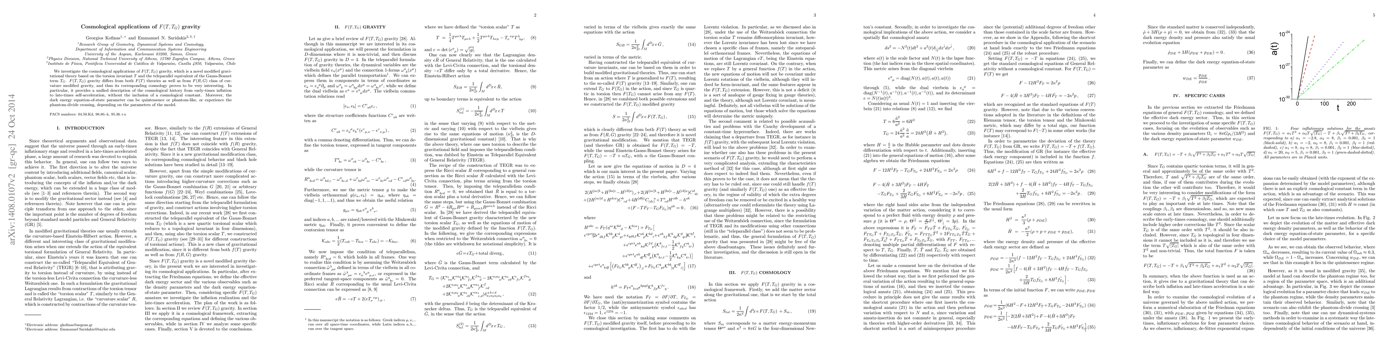 This paper explores the cosmological implications of $F(T,T_G)$ gravity, a modified gravitational theory incorporating torsion and the teleparallel equivalent of the Gauss-Bonnet term. It offers a unified cosmological model from inflation to late-time acceleration, without requiring a cosmological constant, and allows for diverse dark energy behaviors.