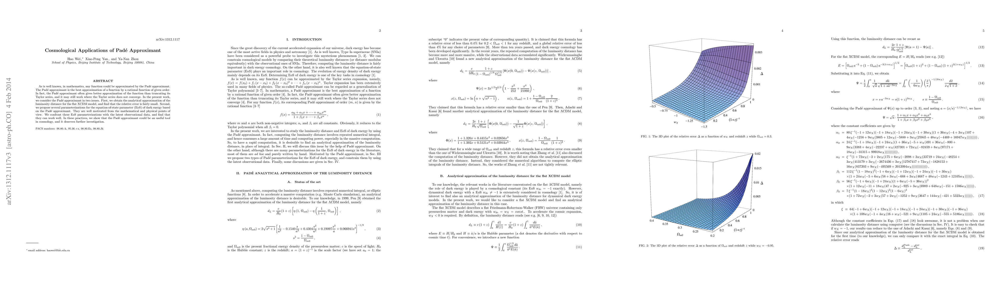 This paper explores the cosmological applications of the Padé approximant, demonstrating its utility in approximating the luminosity distance for the flat XCDM model and proposing new parameterizations for the equation-of-state parameter of dark energy. The results suggest that the Padé approximant is a valuable tool in cosmology.