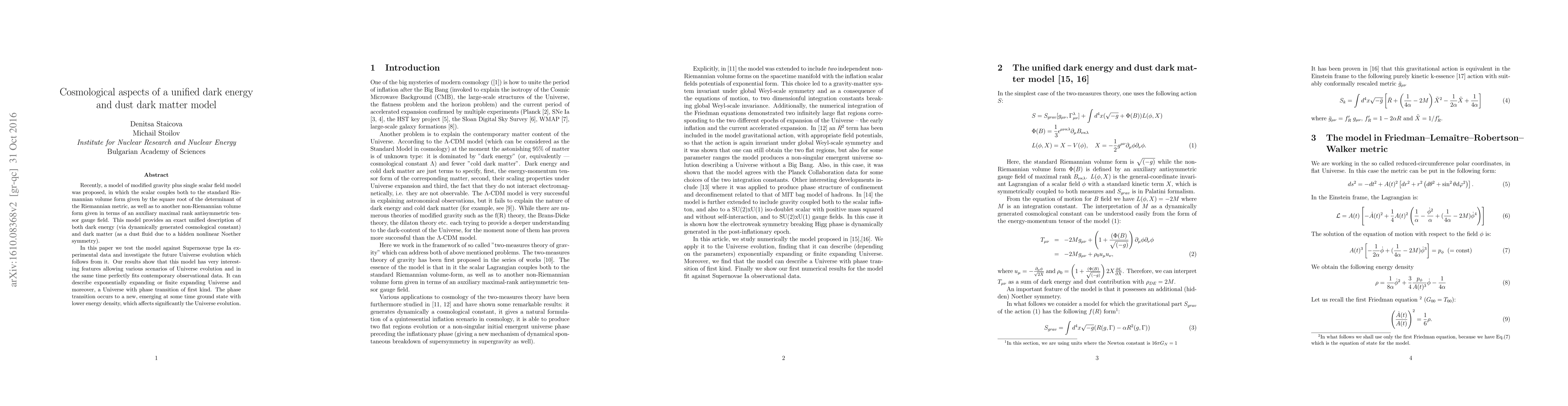 Recently, a model of modified gravity plus single scalar field model was proposed, in which the scalar couples both to the standard Riemannian volume form given by the square root of the determinant of the Riemannian metric, as well as to another non-Riemannian volume form given in terms of an auxiliary maximal rank antisymmetric tensor gauge field. This model provides an exact unified description of both dark energy (via dynamically generated cosmological constant) and dark matter (as a "dust" fluid due to a hidden nonlinear Noether symmetry). In this paper we test the model against Supernovae type Ia experimental data and investigate the future Universe evolution which follows from it. Our results show that this model has very interesting features allowing various scenarios of Universe evolution and in the same time perfectly fits contemporary observational data. It can describe exponentially expanding or finite expanding Universe and moreover, a Universe with phase transition of first kind. The phase transition occurs to a new, emerging at some time ground state with lower energy density, which affects significantly the Universe evolution.