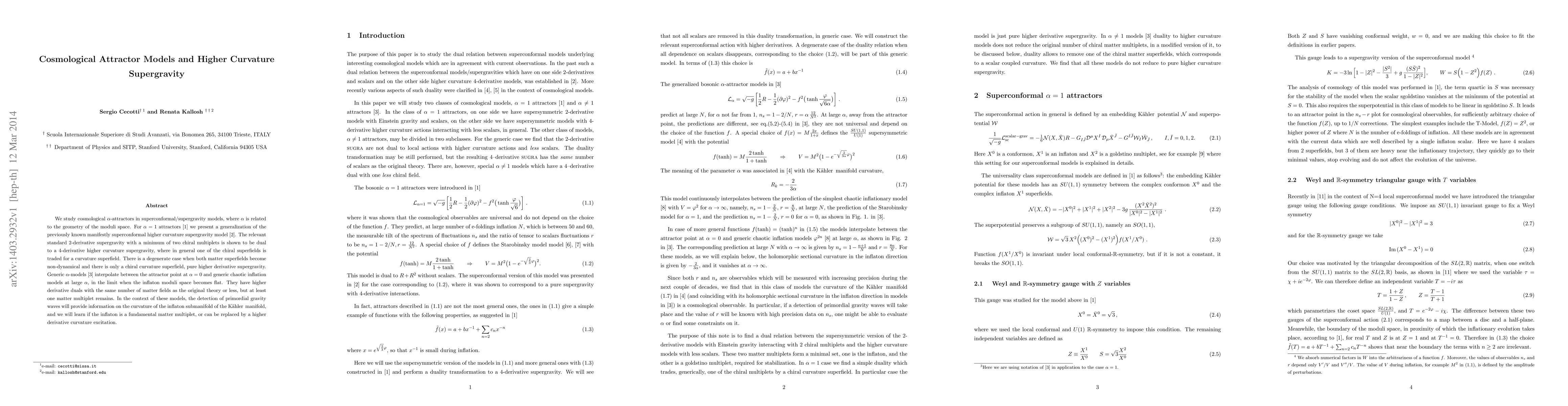 This paper explores cosmological $\alpha$-attractor models in superconformal/supergravity frameworks, showing that standard 2-derivative supergravity with two chiral multiplets is dual to a 4-derivative higher curvature supergravity. Detection of primordial gravity waves can reveal the nature of the inflaton field in these models.