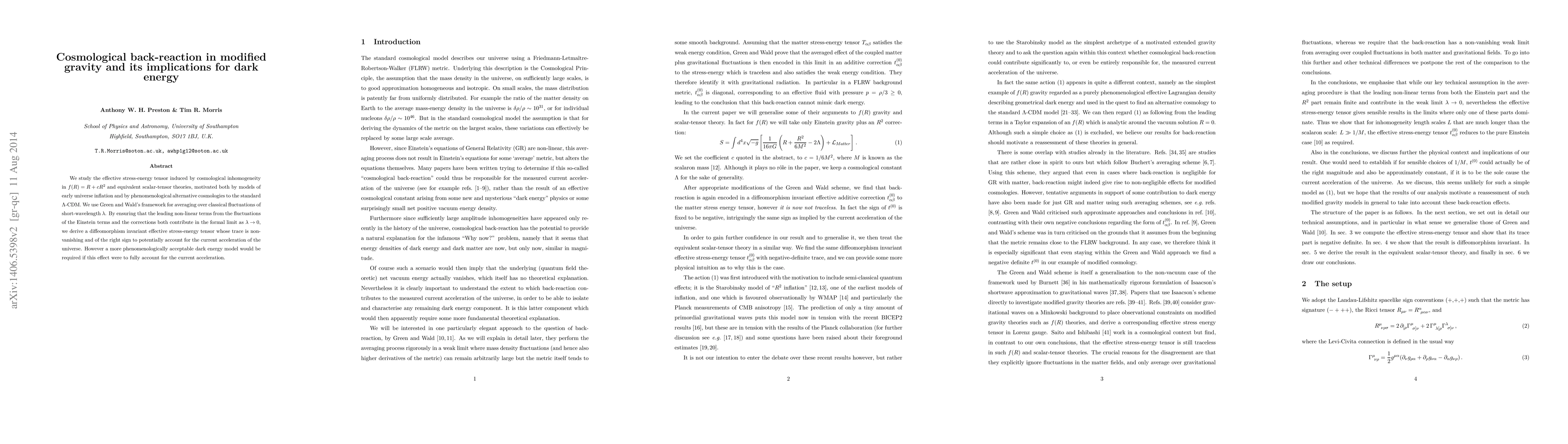 We study the effective stress-energy tensor induced by cosmological inhomogeneity in $f(R)=R+cR^2$ and equivalent scalar-tensor theories, motivated both by models of early universe inflation and by phenomenological alternative cosmologies to the standard $\Lambda$-CDM. We use Green and Wald's framework for averaging over classical fluctuations of short-wavelength $\lambda$. By ensuring that the leading non-linear terms from the fluctuations of the Einstein terms and the corrections both contribute in the formal limit as $\lambda\to0$, we derive a diffeomorphism invariant effective stress-energy tensor whose trace is non-vanishing and of the right sign to potentially account for the current acceleration of the universe. However a more phenomenologically acceptable dark energy model would be required if this effect were to fully account for the current acceleration.