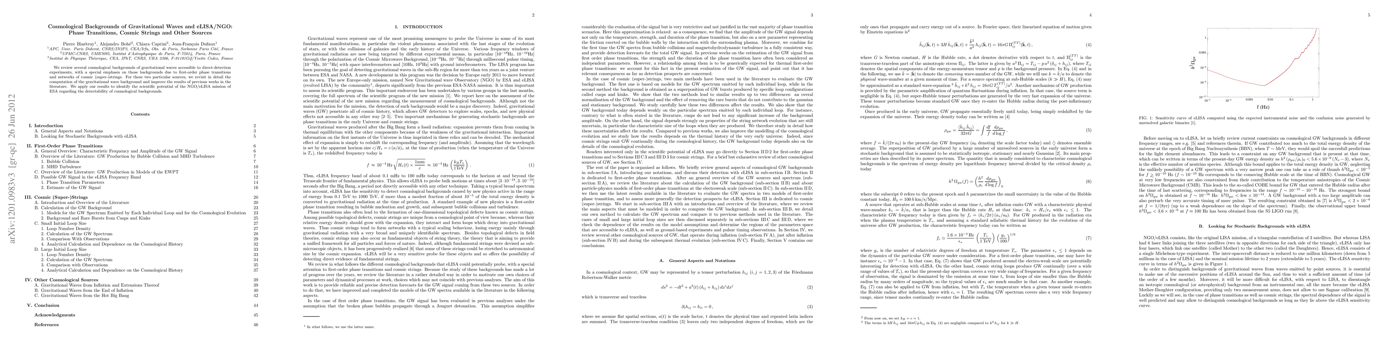 This paper reviews gravitational wave backgrounds from cosmological phenomena, focusing on first-order phase transitions and cosmic strings. It provides improved calculations for these sources and assesses the eLISA/NGO mission's capability to detect these backgrounds.