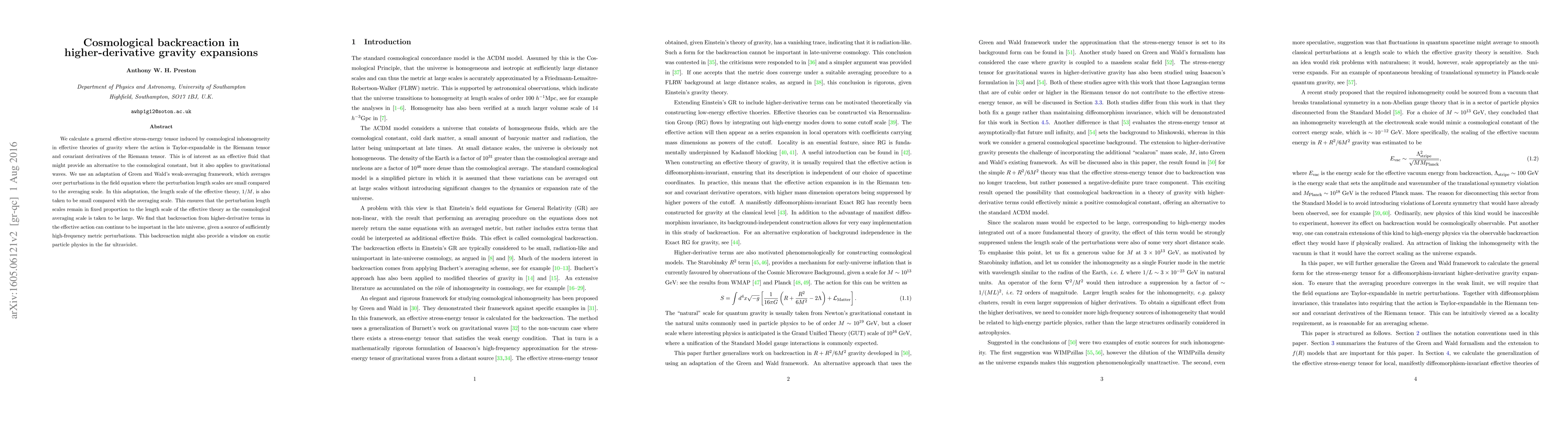 This paper investigates the effective stress-energy tensor induced by cosmological inhomogeneities in higher-derivative gravity theories, finding that backreaction from higher-derivative terms can remain significant in the late universe, potentially offering insights into exotic particle physics. The study employs an adapted weak-averaging framework to analyze these effects.