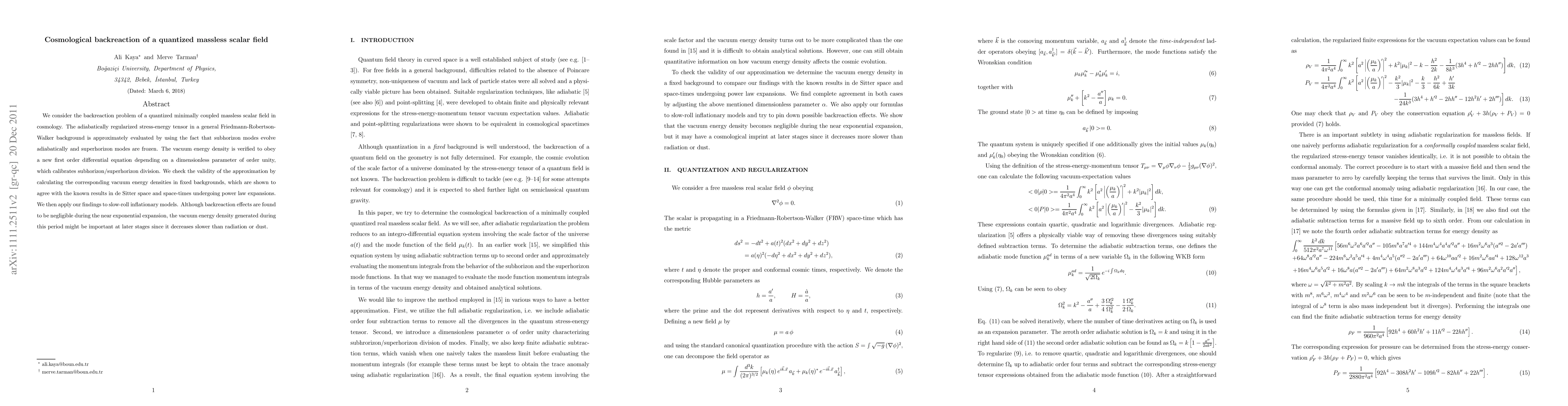 This paper investigates the cosmological backreaction of a quantized massless scalar field in a Friedmann-Robertson-Walker background, finding that backreaction effects are negligible during inflation but the vacuum energy density generated may have significant implications later. The study uses adiabatic regularization to evaluate the stress-energy tensor and validates the approach through comparisons with known results in de Sitter and power law space-times.