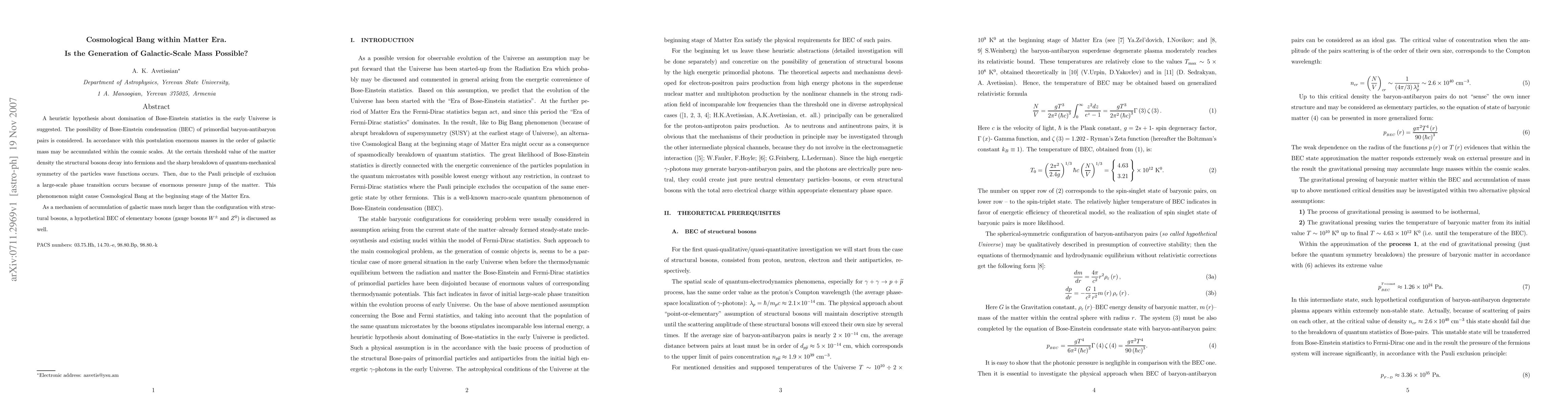 A heuristic hypothesis about domination of Bose-Einstein statistics in the early Universe is suggested. The possibility of Bose-Einstein condensation (BEC) of primordial baryon-antibaryon pairs is considered. In accordance with this postulation enormous masses in the order of galactic mass may be accumulated within the cosmic scales. At the certain threshold value of the matter density the structural bosons decay into fermions and the sharp breakdown of quantum-mechanical symmetry of the particles wave functions occurs. Then, due to the Pauli principle of exclusion a large-scale phase transition occurs because of enormous pressure jump of the matter. This phenomenon might cause Cosmological Bang at the beginning stage of the Matter Era. As a mechanism of accumulation of galactic mass much larger than the configuration with structural bosons, a hypothetical BEC of elementary bosons (gauge bosons $W^{\pm}$ and $Z^{0})$ is discussed as well.