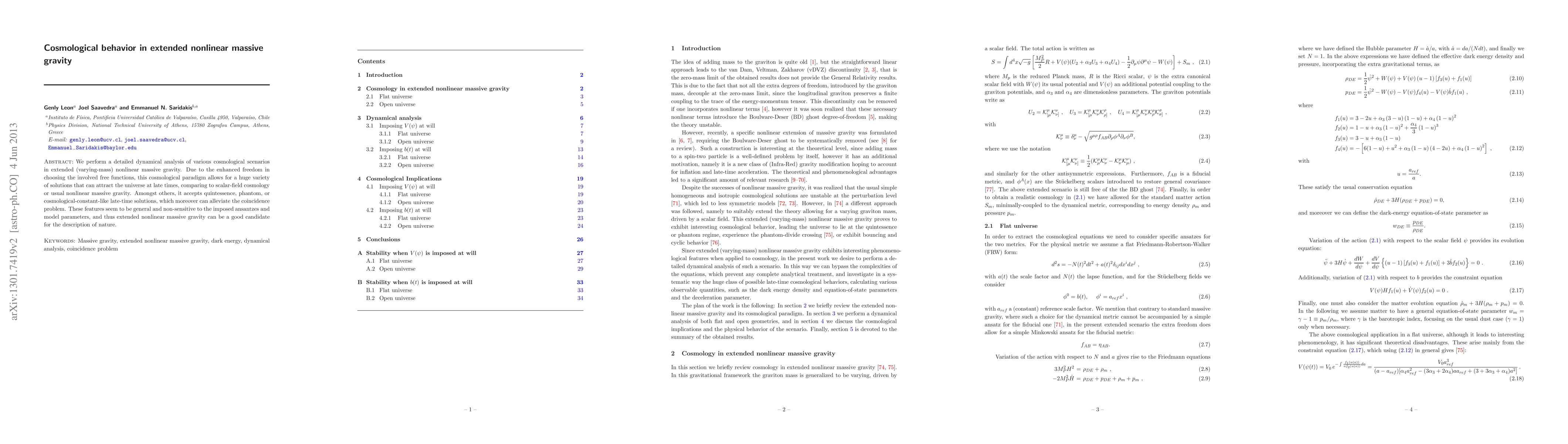 This paper investigates cosmological models in extended nonlinear massive gravity, revealing diverse late-time solutions including quintessence, phantom, and cosmological-constant-like behaviors that can resolve the coincidence problem, suggesting this framework as a viable candidate for describing the universe's evolution.