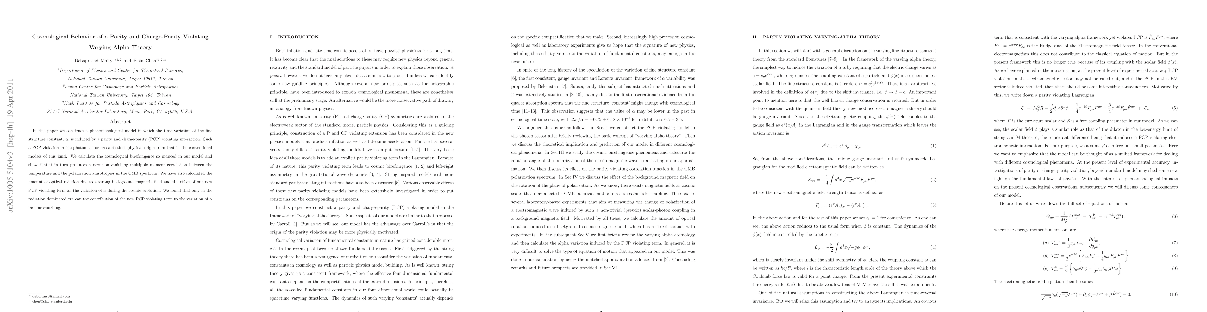 In this report we construct a phenomenological model in which the time variation of the fine structure constant, $\alpha$, is induced by a parity and charge-parity (PCP) violating interaction. Such a PCP violation in the photon sector has a distinct physical origin from that in the conventional models of this kind. We calculate the cosmological birefringence so induced in our model and show that it in turn produces a new non-vanishing multipole moment correlation between the temperature and the polarization anisotropies in the CMB spectrum. We have also calculated the amount of optical rotation due to a strong background magnetic field and the effect of our new PCP violating term on the variation of $\alpha$ during the cosmic evolution. We found that only in the radiation dominated era can the contribution of the new PCP violating term to the variation of $\alpha$ be non-vanishing.
