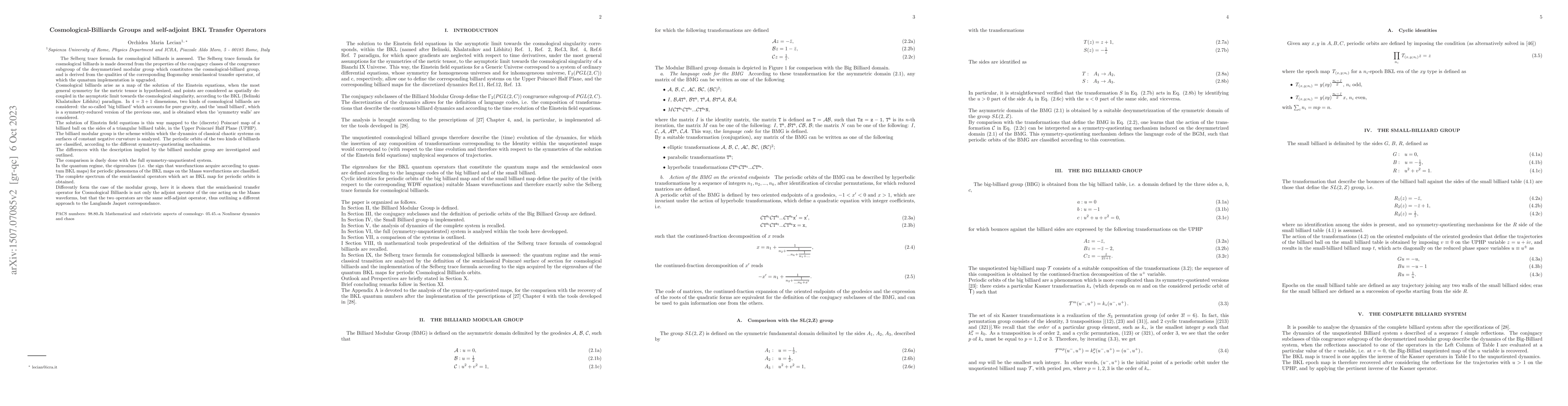 This paper explores cosmological billiards as solutions to Einstein's equations in the context of the BKL paradigm, mapping them to discrete Poincaré maps on a triangular billiard table. It classifies periodic orbits and identifies the semiclassical BKL transfer operator as a self-adjoint operator, differing from the modular group's adjoint operator.