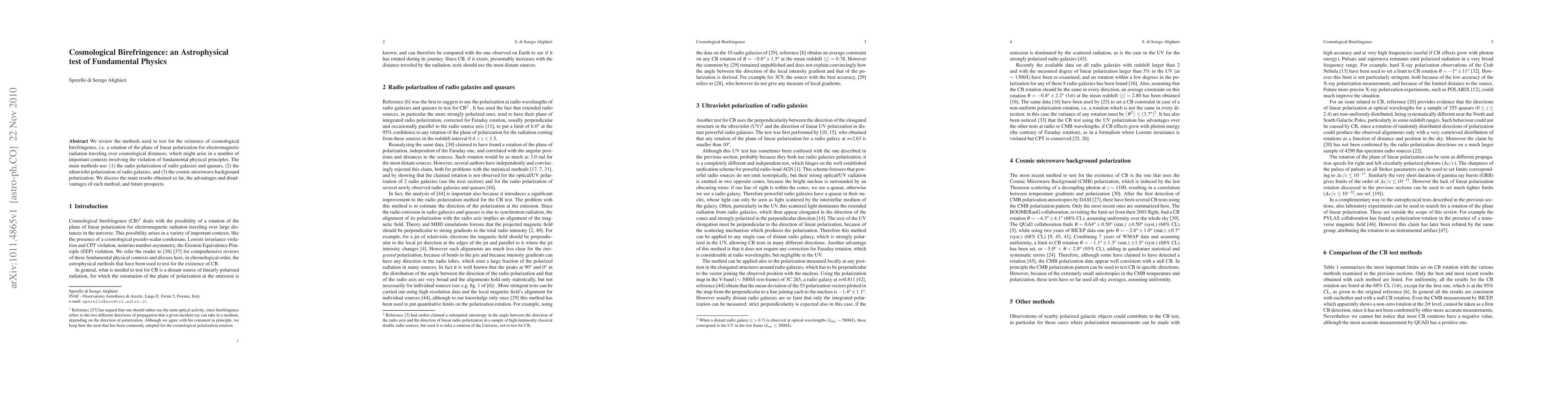 We review the methods used to test for the existence of cosmological birefringence, i.e. a rotation of the plane of linear polarization for electromagnetic radiation traveling over cosmological distances, which might arise in a number of important contexts involving the violation of fundamental physical principles. The main methods use: (1) the radio polarization of radio galaxies and quasars, (2) the ultraviolet polarization of radio galaxies, and (3) the cosmic microwave background polarization. We discuss the main results obtained so far, the advantages and disadvantages of each method, and future prospects.