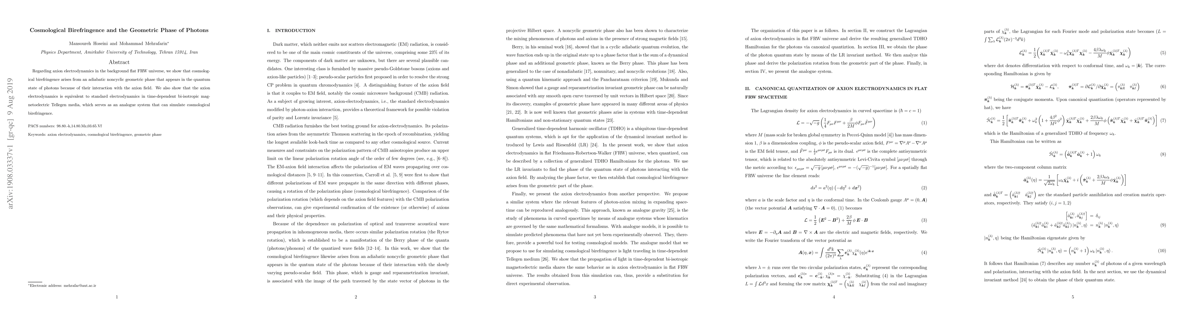 Regarding axion electrodynamics in the background flat FRW universe, we show that cosmological birefringence arises from an adiabatic noncyclic geometric phase that appears in the quantum state of photons because of their interaction with the axion field. We also show that the axion electrodynamics is equivalent to standard electrodynamics in time-dependent bi-isotropic magnetoelectric Tellegen media, which serves as an analogue system that can simulate cosmological birefringence.