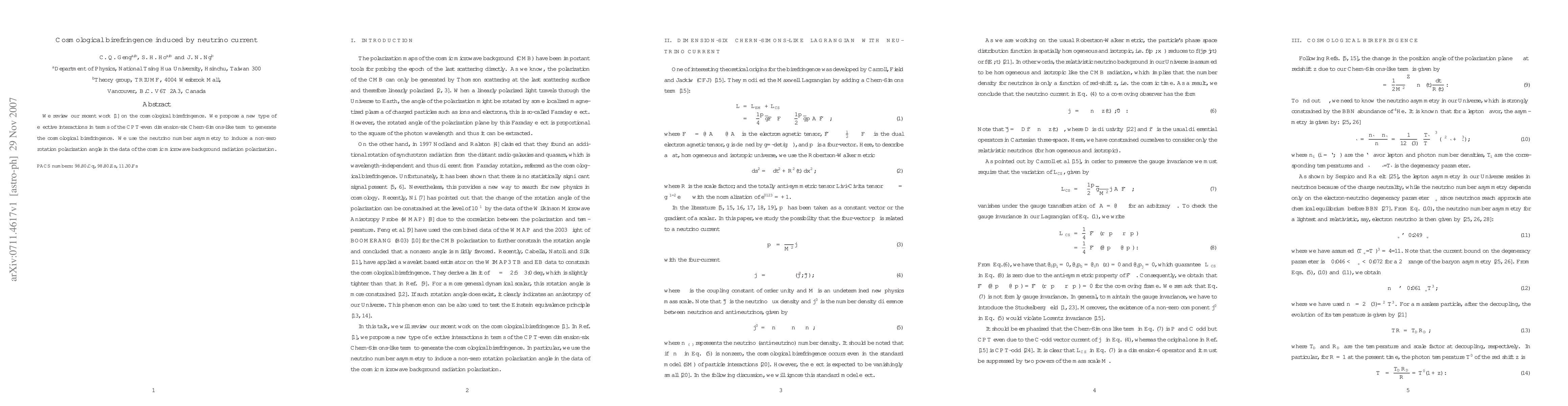 We review our recent work on the cosmological birefringence. We propose a new type of effective interactions in terms of the $CPT$-even dimension-six Chern-Simons-like term to generate the cosmological birefringence. We use the neutrino number asymmetry to induce a non-zero rotation polarization angle in the data of the cosmic microwave background radiation polarization.