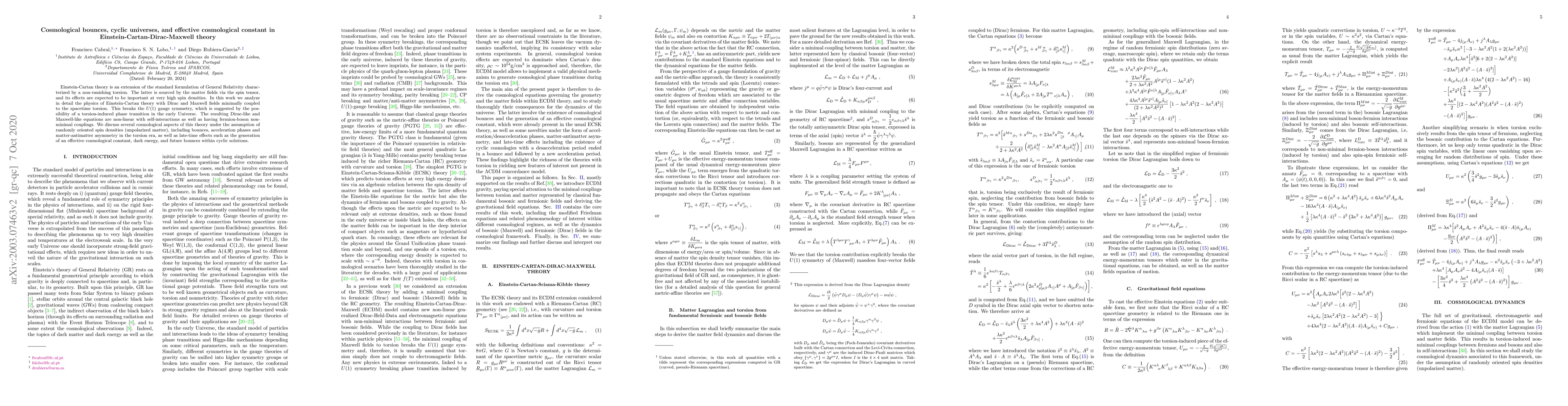 This paper explores the cosmological implications of Einstein-Cartan theory, which incorporates torsion, in the context of Dirac and Maxwell fields, focusing on bounces, cyclic universes, and the generation of an effective cosmological constant. It discusses the potential for torsion-induced phase transitions and cyclic solutions, including dark energy and future bounces.
