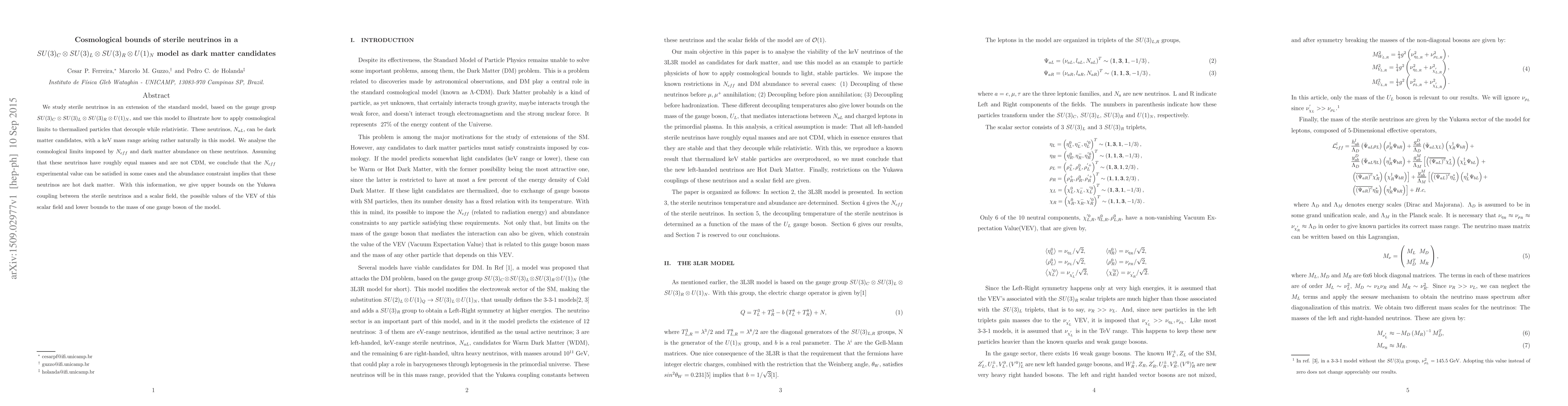 We study sterile neutrinos in an extension of the standard model, based on the gauge group $SU(3)_C\otimes SU(3)_L\otimes SU(3)_R\otimes U(1)_N$, and use this model to illustrate how to apply cosmological limits to thermalized particles that decouple while relativistic. These neutrinos, $N_{aL}$, can be dark matter candidates, with a keV mass range arising rather naturally in this model. We analyse the cosmological limits imposed by $N_{eff}$ and dark matter abundance on these neutrinos. Assuming that these neutrinos have roughly equal masses and are not CDM, we conclude that the $N_{eff}$ experimental value can be satisfied in some cases and the abundance constraint implies that these neutrinos are hot dark matter. With this information, we give upper bounds on the Yukawa coupling between the sterile neutrinos and a scalar field, the possible values of the VEV of this scalar field and lower bounds to the mass of one gauge boson of the model.