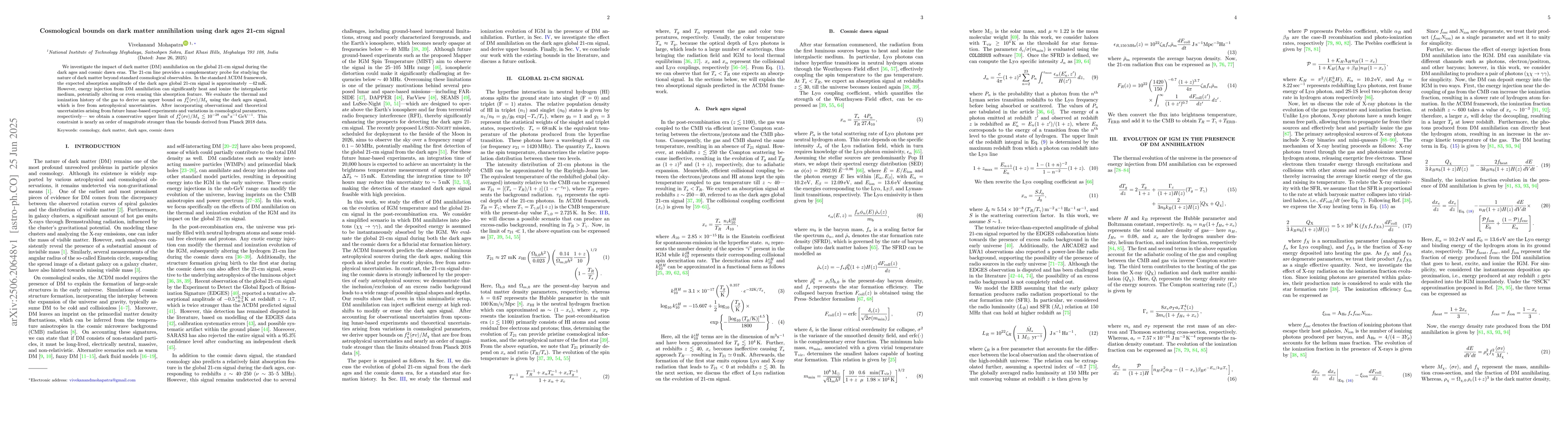We investigate the impact of dark matter (DM) annihilation on the global 21-cm signal during the dark ages and cosmic dawn eras. The 21-cm line provides a complementary probe for studying the nature of dark matter beyond standard cosmological observables. In the standard $\Lambda$CDM framework, the expected absorption amplitude of the dark ages global 21-cm signal is approximately $-42\, \rm mK$. However, energy injection from DM annihilation can significantly heat and ionize the intergalactic medium, potentially altering or even erasing this absorption feature. We evaluate the thermal and ionization history of the gas to derive an upper bound on $f_\chi^2 \langle \sigma v \rangle / M_\chi$ using the dark ages signal, which is free from astrophysical uncertainties. After incorporating observational and theoretical uncertainties arising from future lunar-based experiments and variations in cosmological parameters, respectively -- we obtain a conservative upper limit of $f_\chi^2\langle\sigma v\rangle/M_\chi \lesssim 10^{-28}~\rm cm^3\,s^{-1}\,\rm GeV^{-1}$. This constraint is nearly an order of magnitude stronger than the bounds derived from Planck 2018 data.