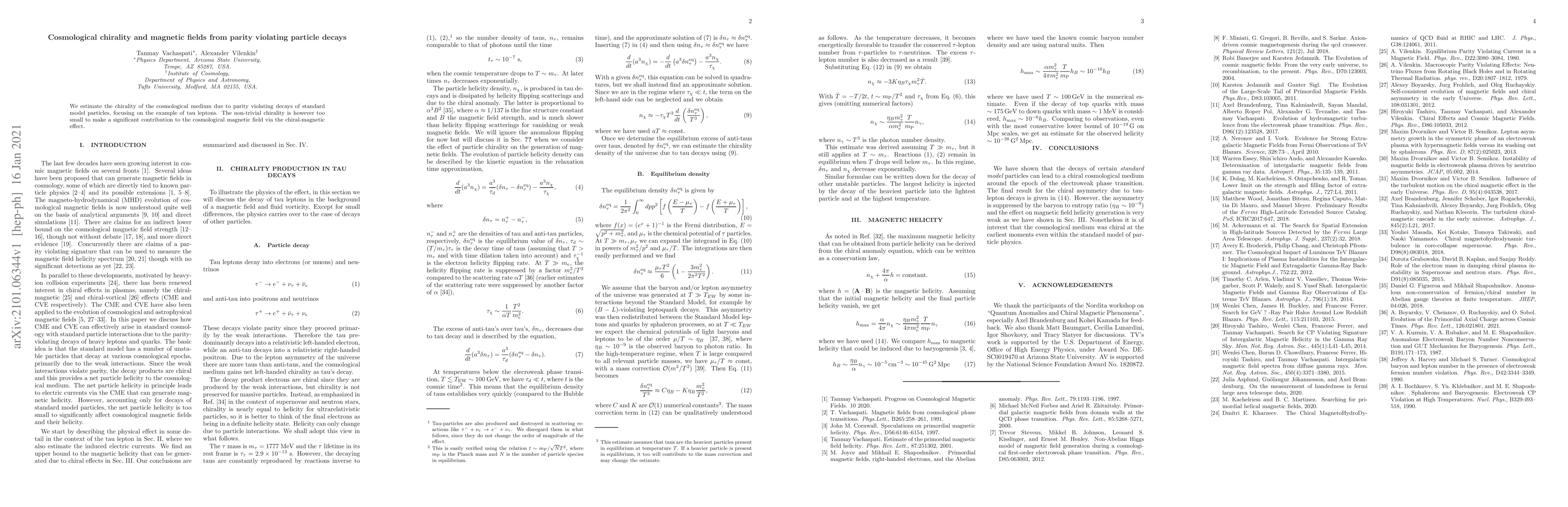 We estimate the chirality of the cosmological medium due to parity violating decays of standard model particles, focusing on the example of tau leptons. The non-trivial chirality is however too small to make a significant contribution to the cosmological magnetic field via the chiral-magnetic effect.