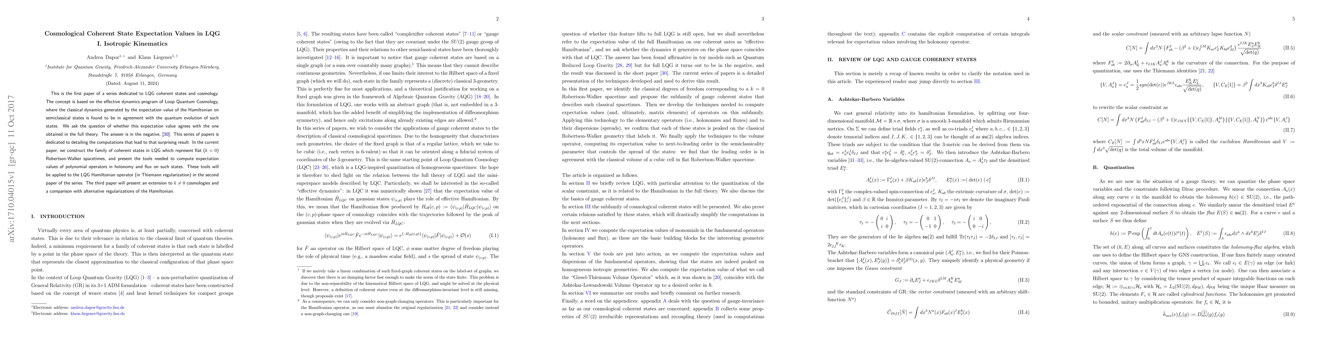 This paper constructs LQG coherent states for isotropic Robertson-Walker spacetimes and provides tools to compute expectation values of operators. The results show discrepancies between effective dynamics and full theory expectations, setting the stage for further exploration in subsequent papers.