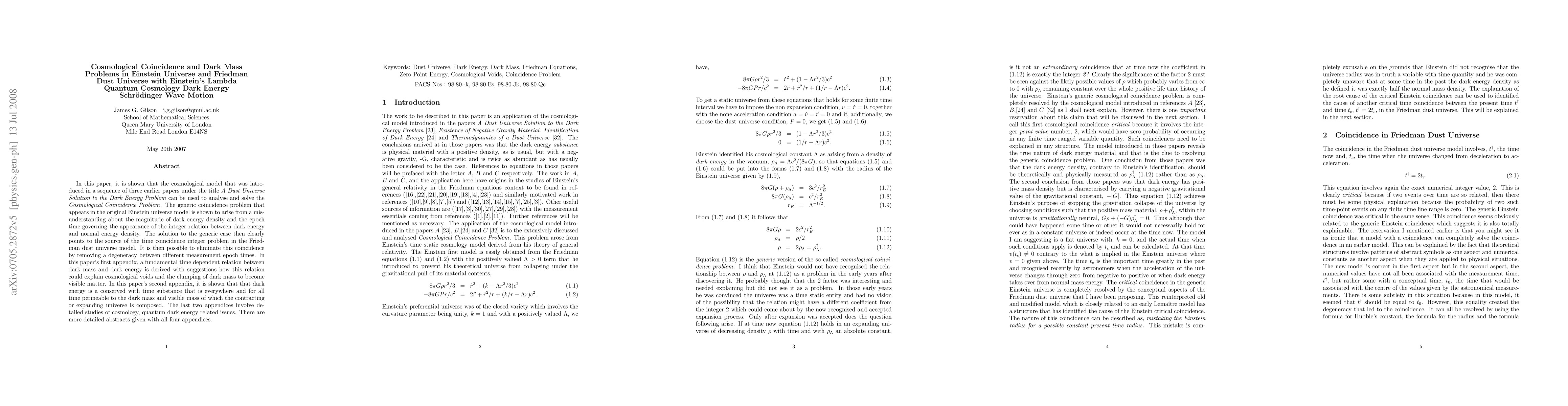 In this paper, it is shown that the cosmological model that was introduced in a sequence of three earlier papers under the title, A Dust Universe Solution to the Dark Energy Problem can be used to analyse and solve the Cosmological Coincidence Problem. The generic coincidence problem that appears in the original Einstein universe model is shown to arise from a misunderstanding about the magnitude of dark energy density and the epoch time governing the appearance of the integer relation between dark energy and normal energy density. The solution to the generic case then clearly points to the source of the time coincidence integer problem in the Friedman dust universe model. It is then possible to eliminate this coincidence by removing a degeneracy between different measurement epoch times. In this paper's first appendix, a fundamental time dependent relation between dark mass and dark energy is derived with suggestions how this relation could explain cosmological voids and the clumping of dark mass to become visible matter. In this paper's second appendix, it is shown that that dark energy is a conserved with time substance that is everywhere and for all time permeable to the dark mass and visible mass of which the contracting or expanding universe is composed. The last two appendices involve detailed studies of cosmology, quantum dark energy related issues. There are more detailed abstracts given with all four appendices.