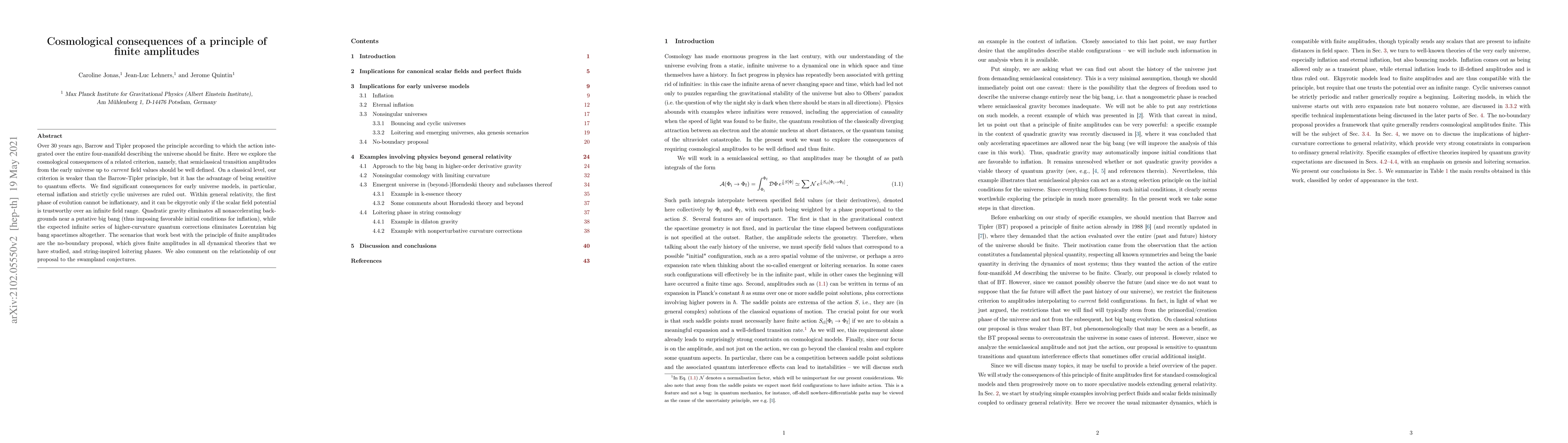 Over 30 years ago, Barrow & Tipler proposed the principle according to which the action integrated over the entire 4-manifold describing the universe should be finite. Here we explore the cosmological consequences of a related criterion, namely that semi-classical transition amplitudes from the early universe up to current field values should be well defined. On a classical level, our criterion is weaker than the Barrow-Tipler principle, but it has the advantage of being sensitive to quantum effects. We find significant consequences for early universe models, in particular: eternal inflation and strictly cyclic universes are ruled out. Within general relativity, the first phase of evolution cannot be inflationary, and it can be ekpyrotic only if the scalar field potential is trustworthy over an infinite field range. Quadratic gravity eliminates all non-accelerating backgrounds near a putative big bang (thus imposing favourable initial conditions for inflation), while the expected infinite series of higher-curvature quantum corrections eliminates Lorentzian big bang spacetimes altogether. The scenarios that work best with the principle of finite amplitudes are the no-boundary proposal, which gives finite amplitudes in all dynamical theories that we have studied, and string-inspired loitering phases. We also comment on the relationship of our proposal to the swampland conjectures.