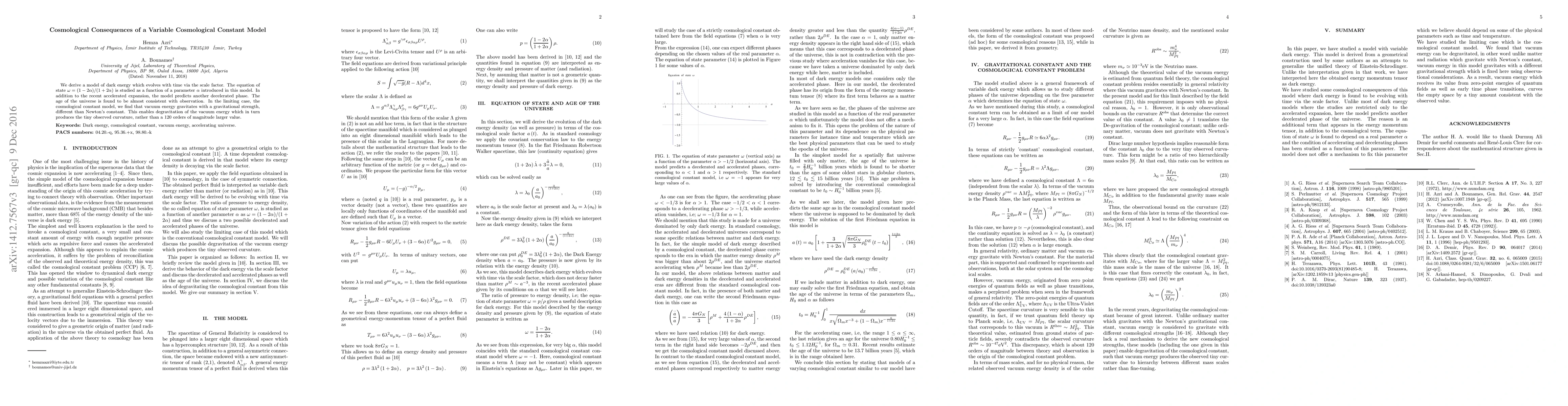 We derive a model of dark energy which evolves with time via the scale factor. The equation of state $\omega=(1-2\alpha)/(1+2\alpha)$ is studied as a function of a parameter $\alpha$ introduced in this model. In addition to the recent accelerated expansion, the model predicts another decelerated phase. The age of the universe is found to be almost consistent with observation. In the limiting case, the cosmological constant model, we find that vacuum energy gravitates with a gravitational strength, different than Newton's constant. This enables degravitation of the vacuum energy which in turn produces the tiny observed curvature, rather than a 120 orders of magnitude larger value.