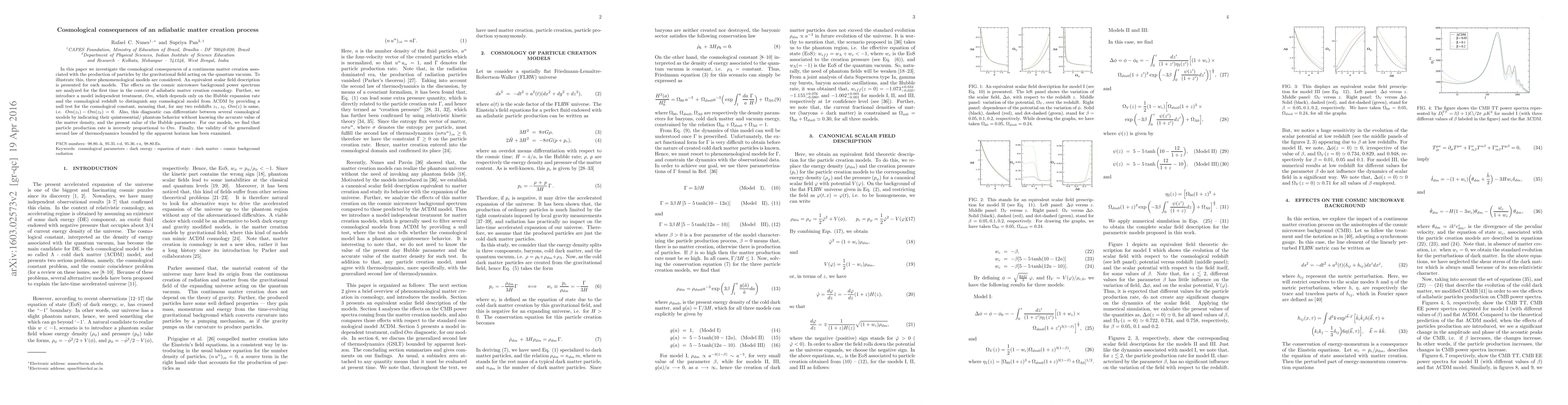 This paper explores the cosmological implications of an adiabatic matter creation process, analyzing three phenomenological models and their effects on the cosmic microwave background power spectrum. It introduces a model-independent diagnostic, $Om$, to distinguish between cosmological models and test the cosmological constant, finding that the particle production rate is inversely proportional to $Om$.