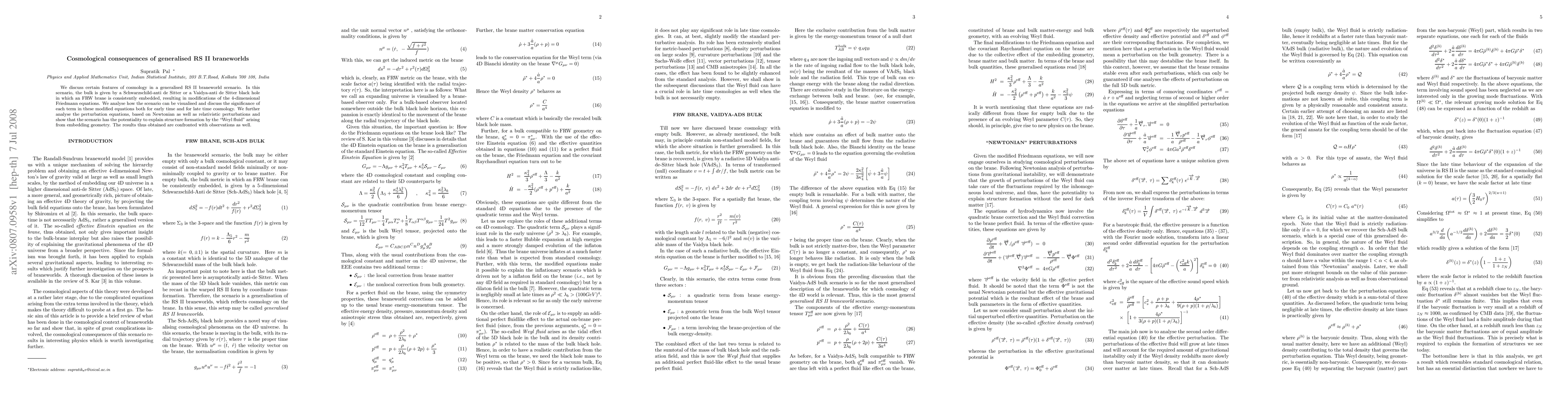 We discuss certain features of cosmology in a generalised RS II braneworld scenario. In this scenario, the bulk is given by a Schwarzschild-anti de Sitter or a Vaidya-anti de Sitter black hole in which an FRW brane is consistently embedded, resulting in modifications of the 4-dimensional Friedmann equations. We analyse how the scenario can be visualised and discuss the significance of each term in these modified equations both for early time and for late time cosmology. We further analyse the perturbation equations, based on Newtonian as well as relativistic perturbations and show that the scenario has the potentiality to explain structure formation by the ``Weyl fluid'' arising from embedding geometry. The results thus obtained are confronted with observations as well.
