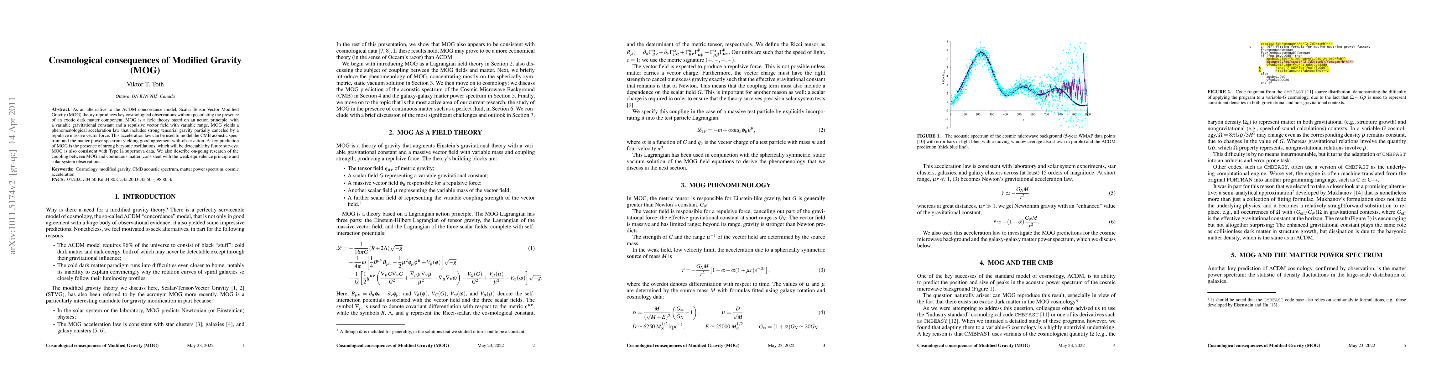 As an alternative to the LCDM concordance model, Scalar-Tensor-Vector Modified Gravity (MOG) theory reproduces key cosmological observations without postulating the presence of an exotic dark matter component. MOG is a field theory based on an action principle, with a variable gravitational constant and a repulsive vector field with variable range. MOG yields a phenomenological acceleration law that includes strong tensorial gravity partially canceled by a repulsive massive vector force. This acceleration law can be used to model the CMB acoustic spectrum and the matter power spectrum yielding good agreement with observation. A key prediction of MOG is the presence of strong baryonic oscillations, which will be detectable by future surveys. MOG is also consistent with Type Ia supernova data. We also describe on-going research of the coupling between MOG and continuous matter, consistent with the weak equivalence principle and solar system observations.