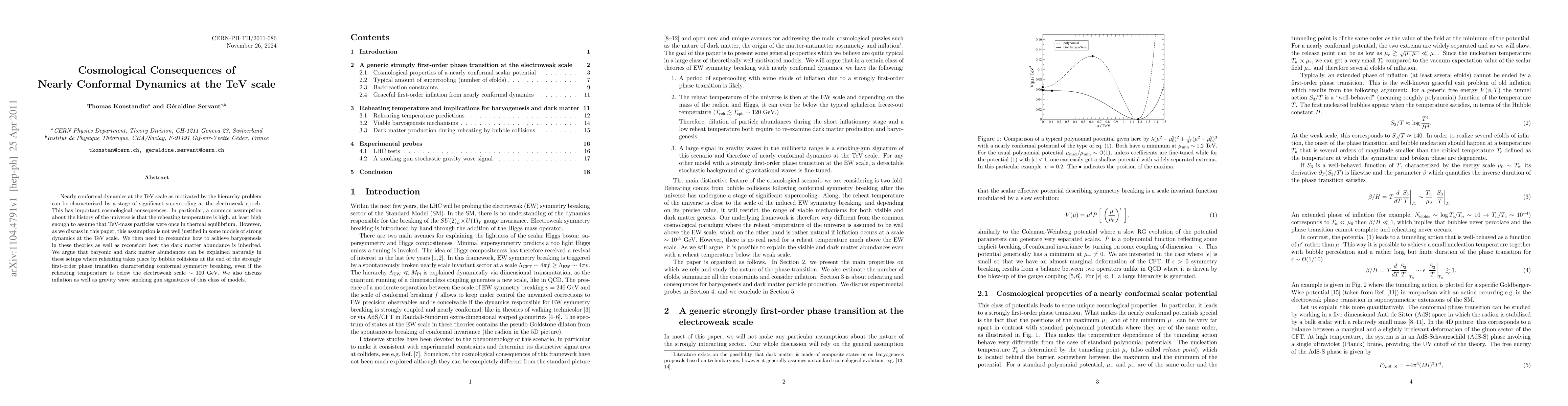 Nearly conformal dynamics at the TeV scale as motivated by the hierarchy problem can be characterized by a stage of significant supercooling at the electroweak epoch. This has important cosmological consequences. In particular, a common assumption about the history of the universe is that the reheating temperature is high, at least high enough to assume that TeV-mass particles were once in thermal equilibrium. However, as we discuss in this paper, this assumption is not well justified in some models of strong dynamics at the TeV scale. We then need to reexamine how to achieve baryogenesis in these theories as well as reconsider how the dark matter abundance is inherited. We argue that baryonic and dark matter abundances can be explained naturally in these setups where reheating takes place by bubble collisions at the end of the strongly first-order phase transition characterizing conformal symmetry breaking, even if the reheating temperature is below the electroweak scale $\sim 100$ GeV. We also discuss inflation as well as gravity wave smoking gun signatures of this class of models.