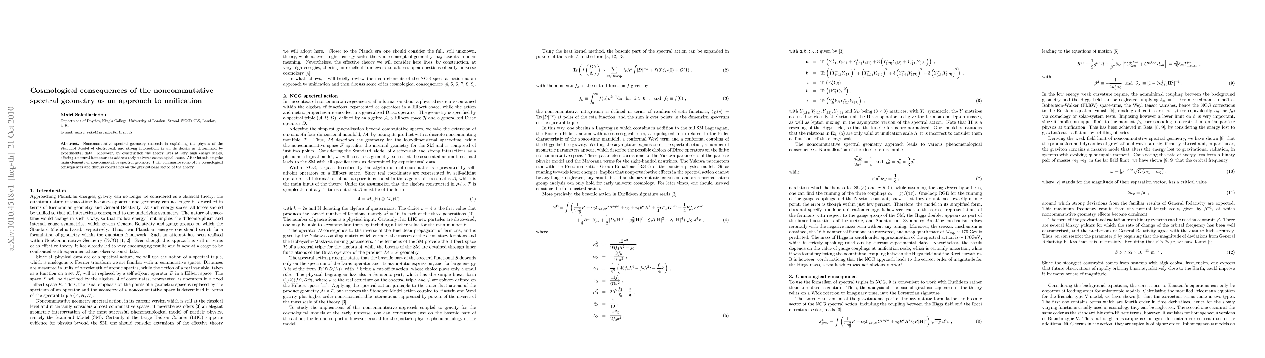 This paper explores how noncommutative spectral geometry can unify fundamental interactions and influence early universe cosmology, summarizing its theoretical framework and its implications for high-energy scales and gravitational constraints.