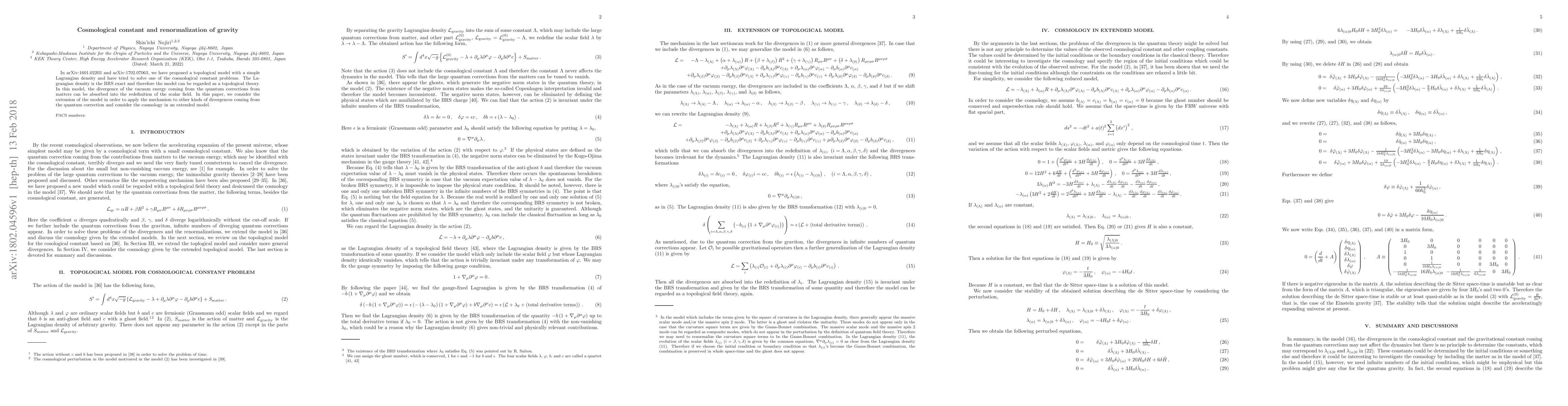 In arXiv:1601.02203 and arXiv:1702.07063, we have proposed a topological model with a simple Lagrangian density and have tried to solve one of the cosmological constant problems. The Lagrangian density is the BRS exact and therefore the model can be regarded as a topological theory. In this model, the divergence of the vacuum energy coming from the quantum corrections from matters can be absorbed into the redefinition of the scalar field. In this paper, we consider the extension of the model in order to apply the mechanism to other kinds of divergences coming from the quantum correction and consider the cosmology in an extended model.