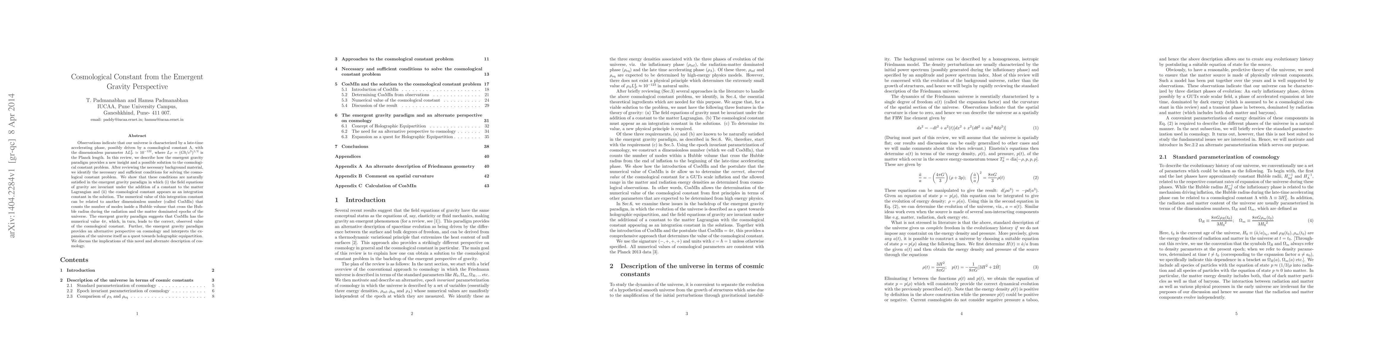 This paper reviews how the emergent gravity paradigm offers a new perspective on the cosmological constant problem, showing that conditions for its solution naturally arise in this framework. It suggests that the observed value of the cosmological constant can be explained by a dimensionless number, CosMIn, linked to the number of modes crossing the Hubble radius, leading to a value of $4\pi$ and resolving the problem.