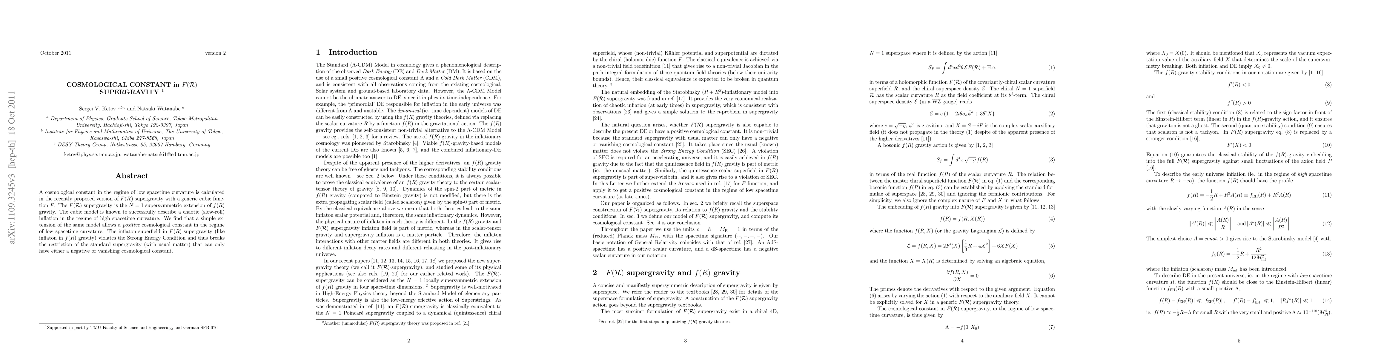 This paper calculates a positive cosmological constant in low space-time curvature within the F(R) supergravity framework, extending a cubic model previously successful in high curvature inflation. The inflaton superfield allows for this by violating the Strong Energy Condition, breaking the standard supergravity restriction to negative or zero cosmological constants.